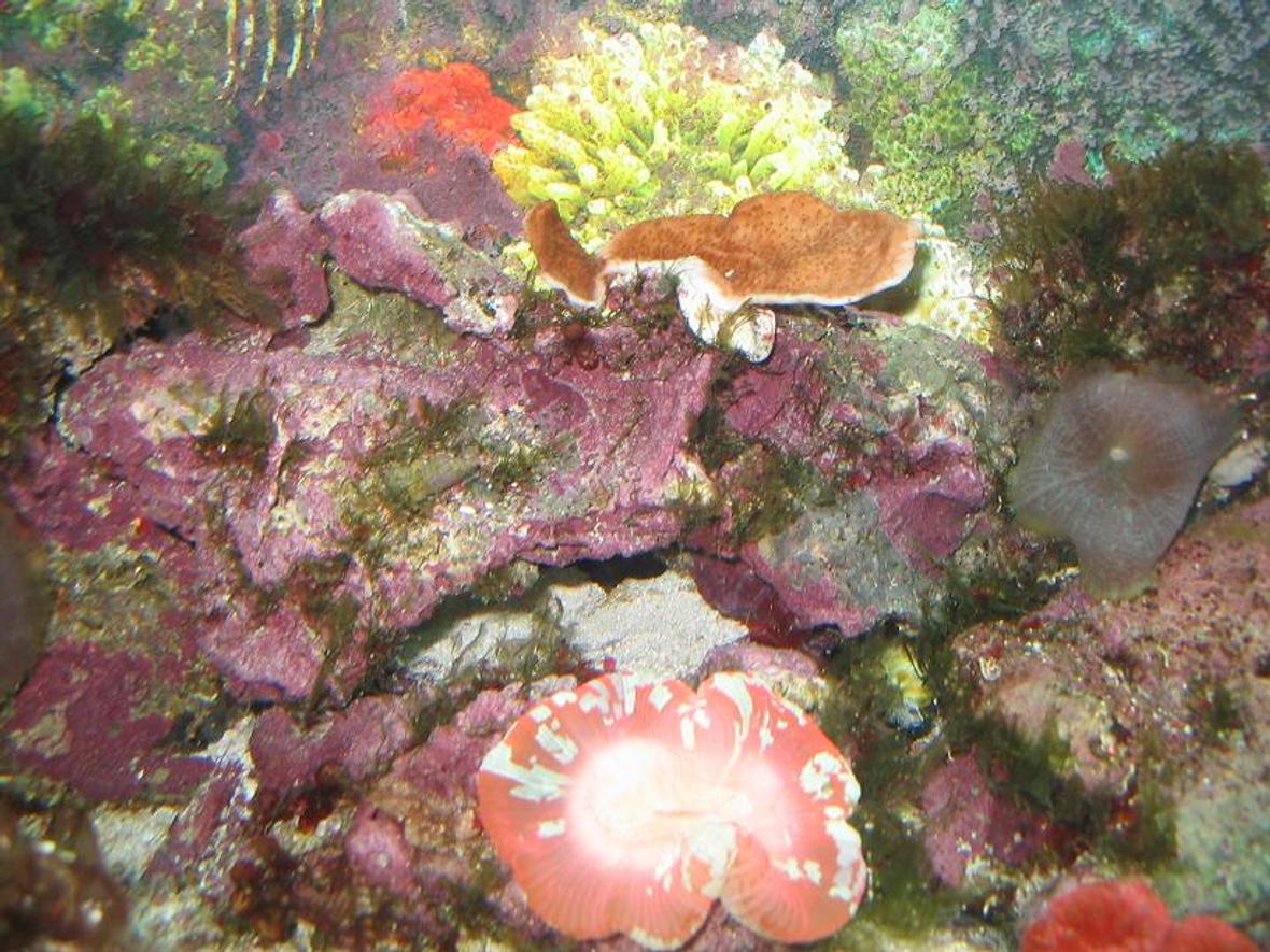 Green star polyps, misc. mushrooms, frogspawn, blastomussa wellsi (with new littlie bud from mother colony) newly added sinularia, montipora capricornus, green zooanthids, brown toadstool coral, red brain coral.