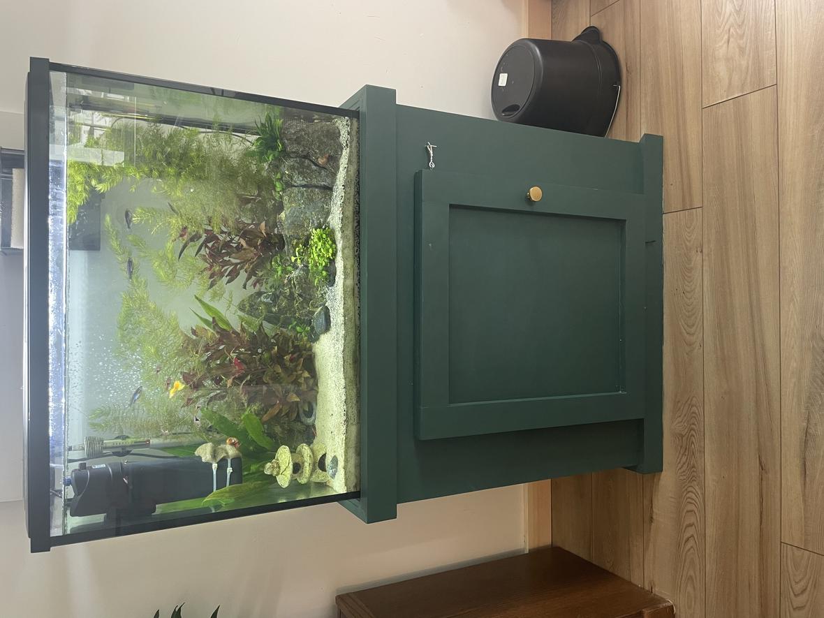 40 gallon Tank. Standard lighting. Topfin pro series hang behind filter. Sand substrate, shrimp aqua soil under. All live plants, and I occasionally use a UV filter to stop algae blooms.