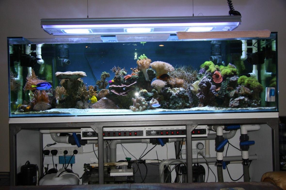 2m x 0.7m x 0.6m deep, twin overflows, 175 litre sump, twin reef sequence dart return pumps, twin controlled Tunze streams, twin Seios, Deltec AP902 skimmer, Aquamedic 1000 Ca reactor, Hailea chiller, 18W UV, Arcadia pendant 3 x 250W 14000K Pheonix bulbs, 2 x 58W blue actinics, moonlight, various other pumps feeding equipment