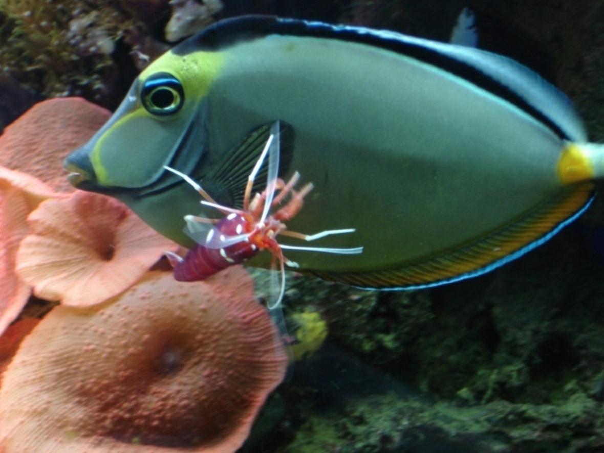 school of six yellow tangs, blue (hippo) tang, Koles tang, mandarin, 4 chromis, blue devil damsel, pair fire clowns, royal dottyback, coral banded shrimp