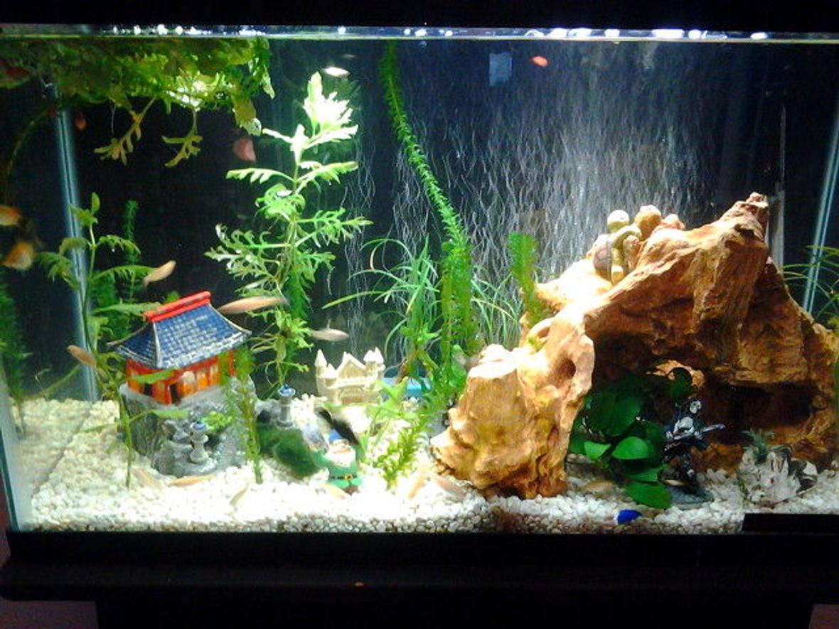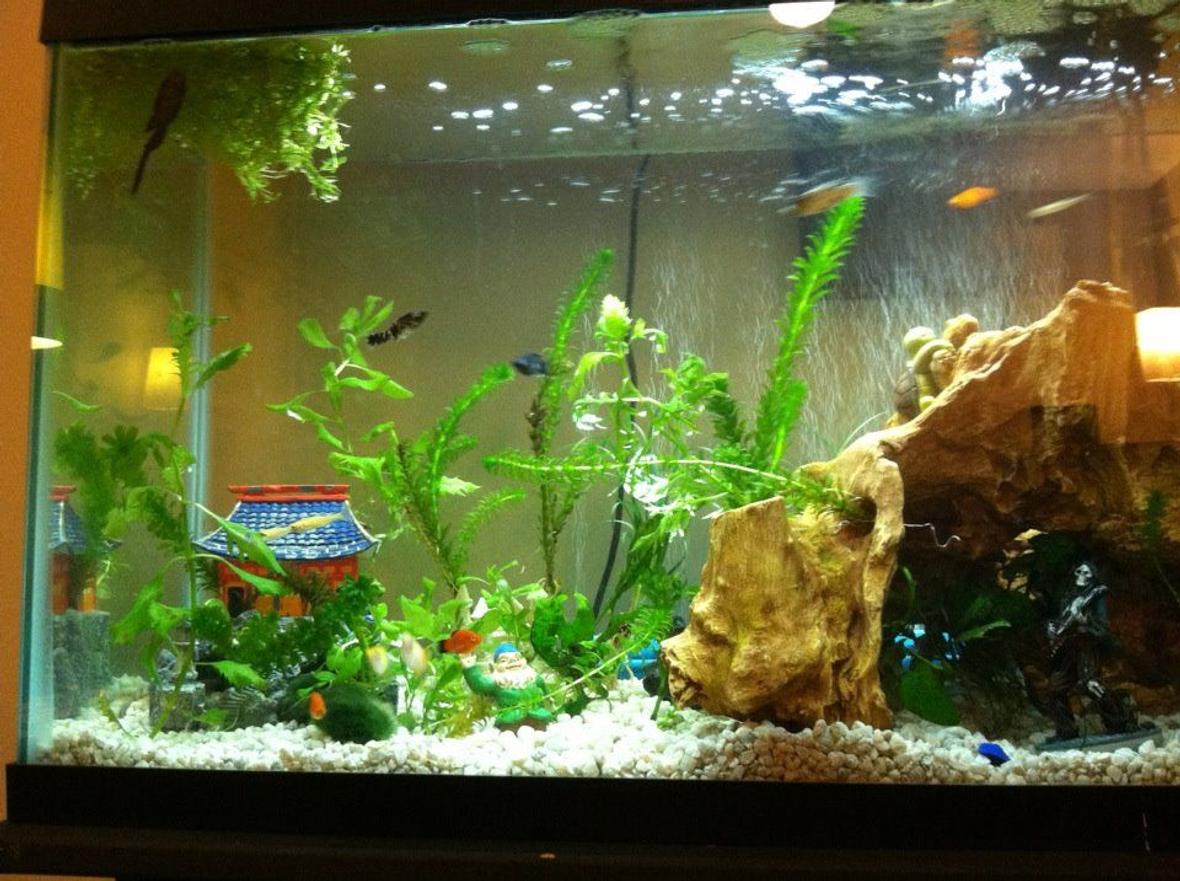 3 Dalmation mollies, 2 sunset platies, 3 mickey mouse platies, 1 pleco, 10 rosies, a few snails and assorted fry. We don't separate the fry and let nature do it's thing.