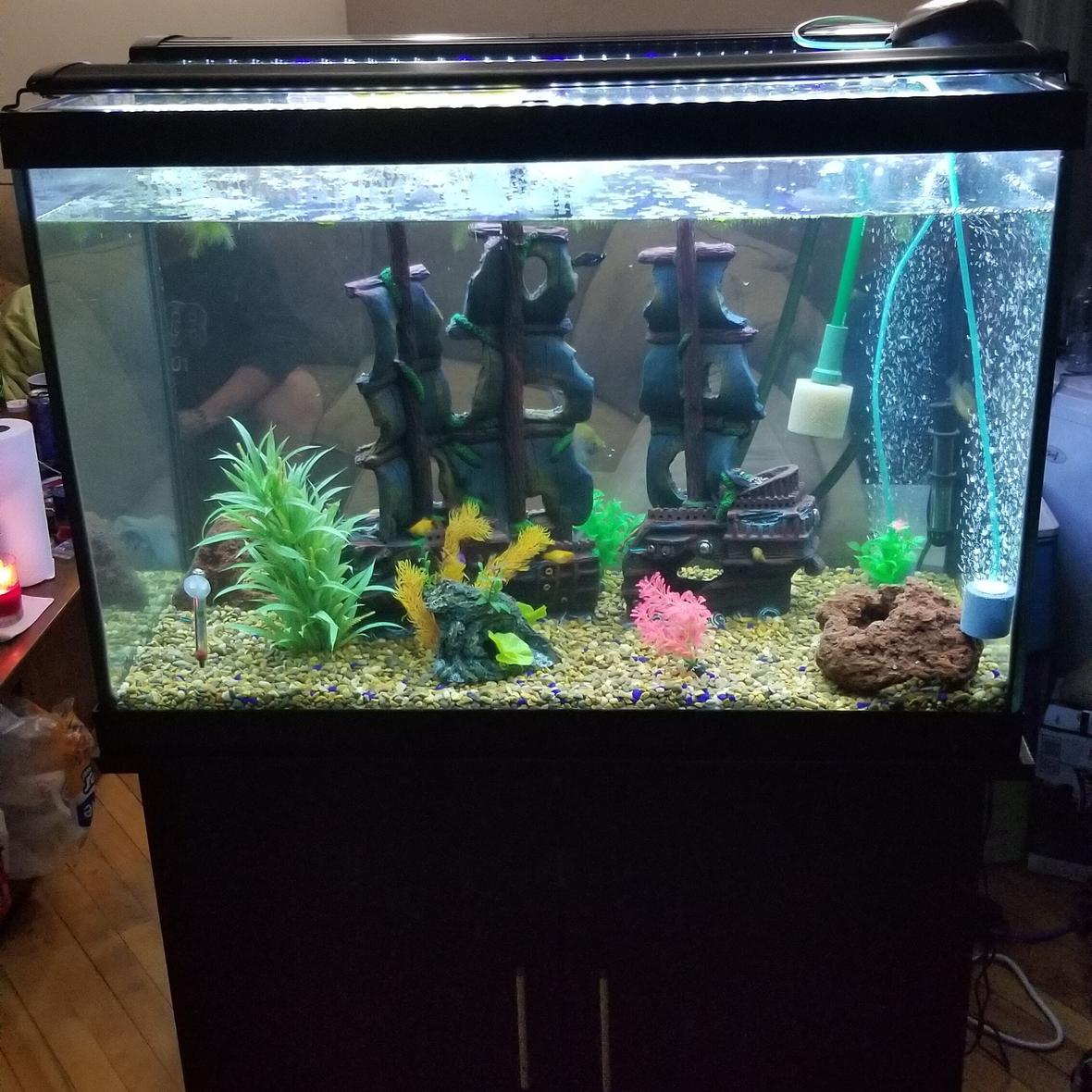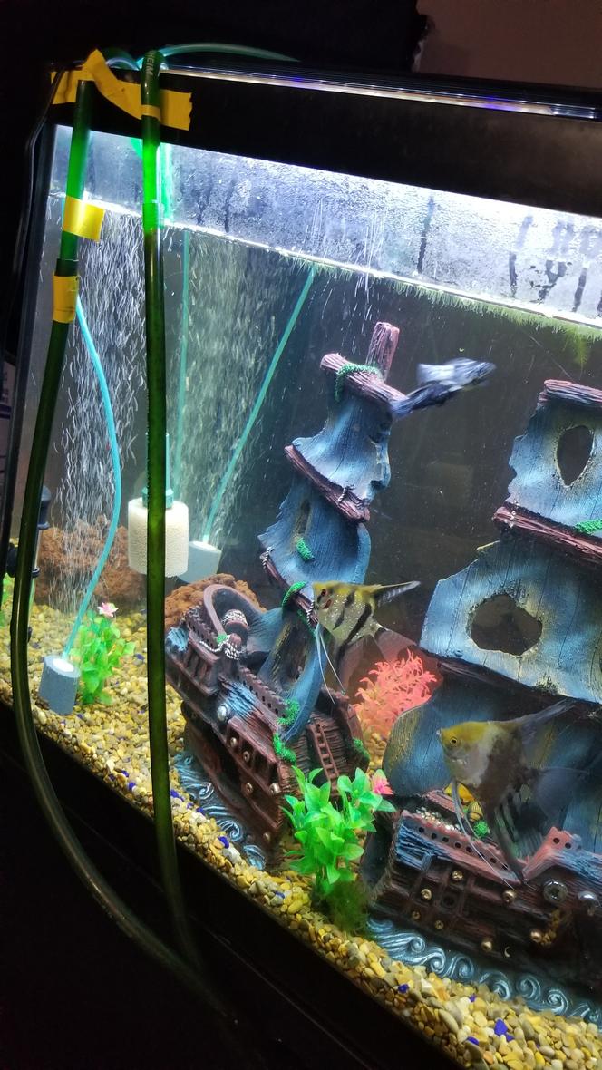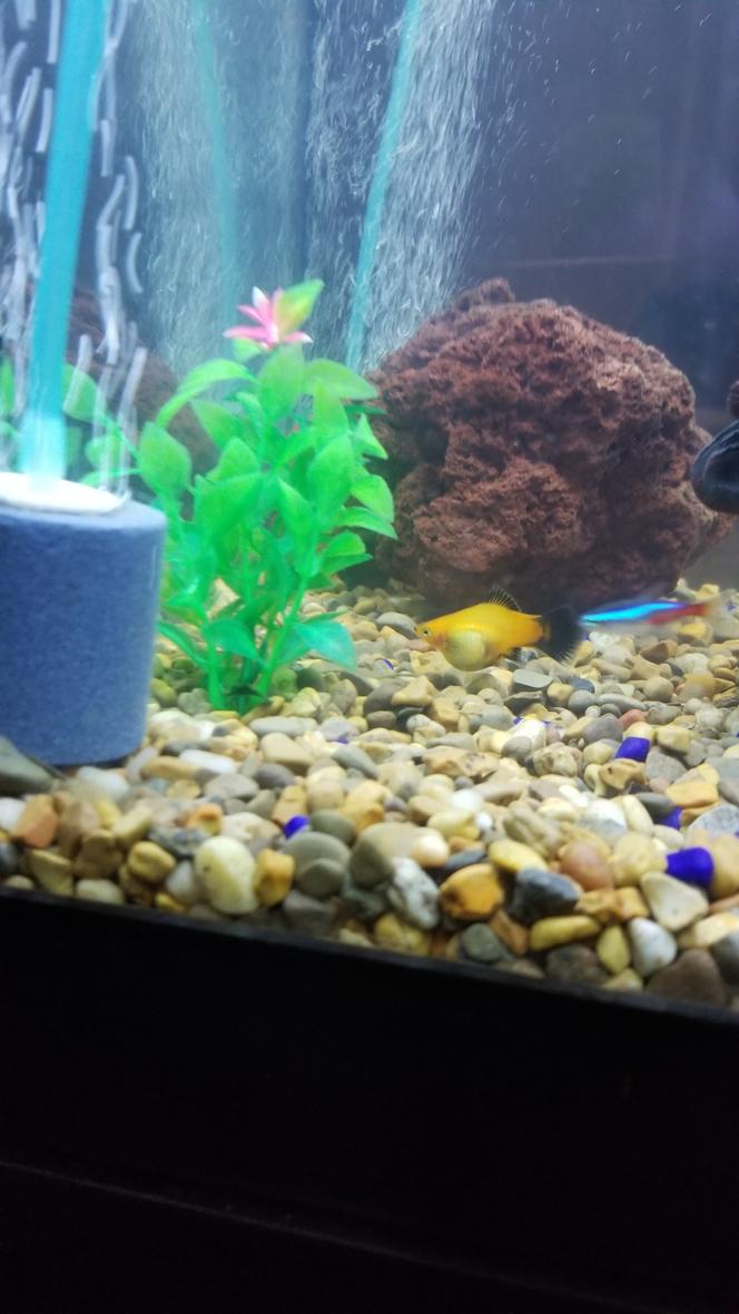 65 gallon with 2 mollys 2 platies 3 grourmis 2 angelfish 1 algae eater and 6 neon tetras lightly plated with java moss duck weed and water lettuce, 2 led lights and an eheim 2215 canister filter