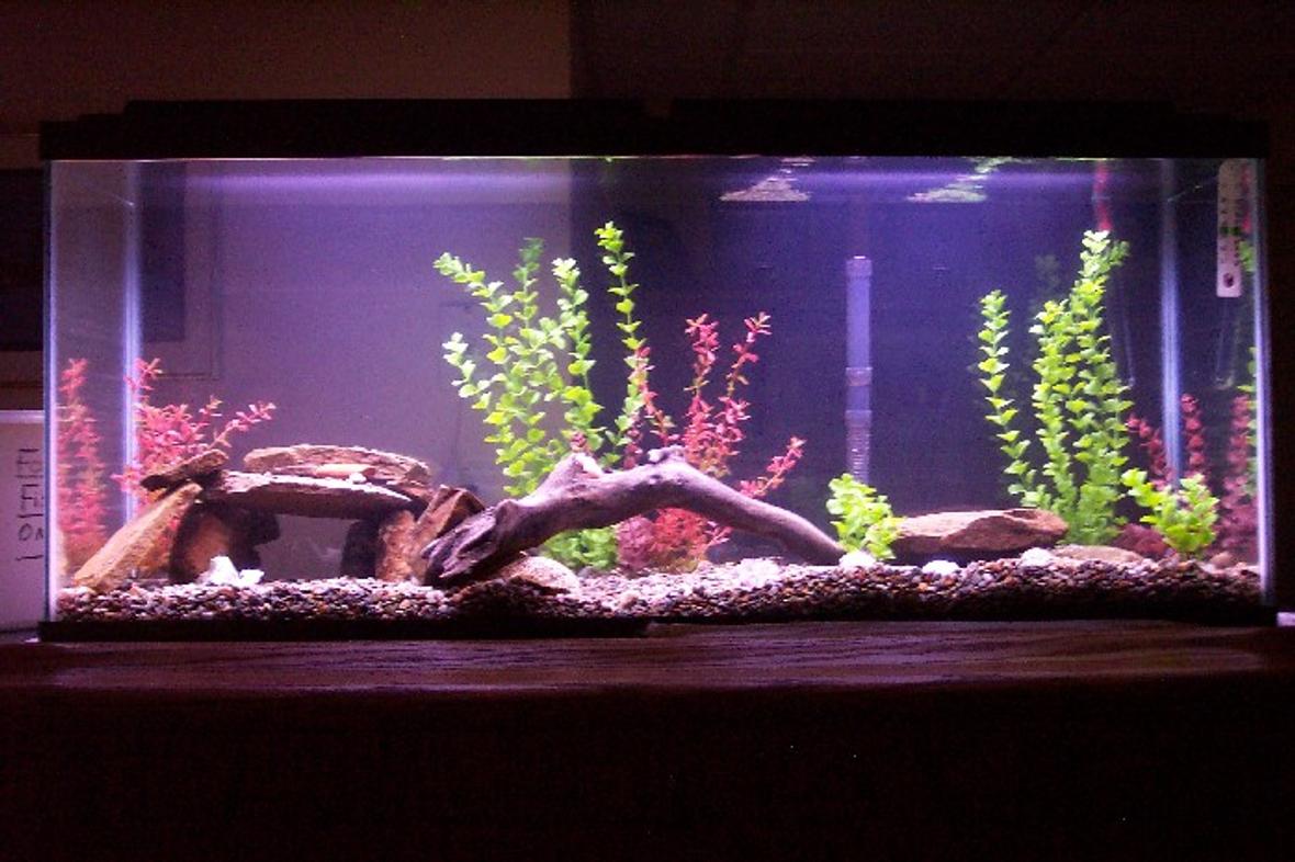 25 gallon, with a ton of hideouts especially for the pleco and the convicts. I have baby convicts but they sleep in the fake plants.