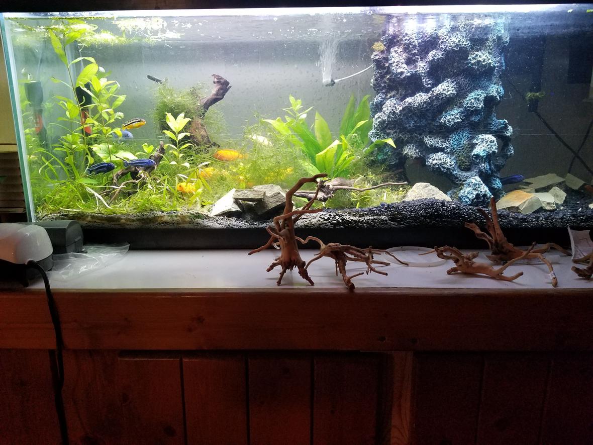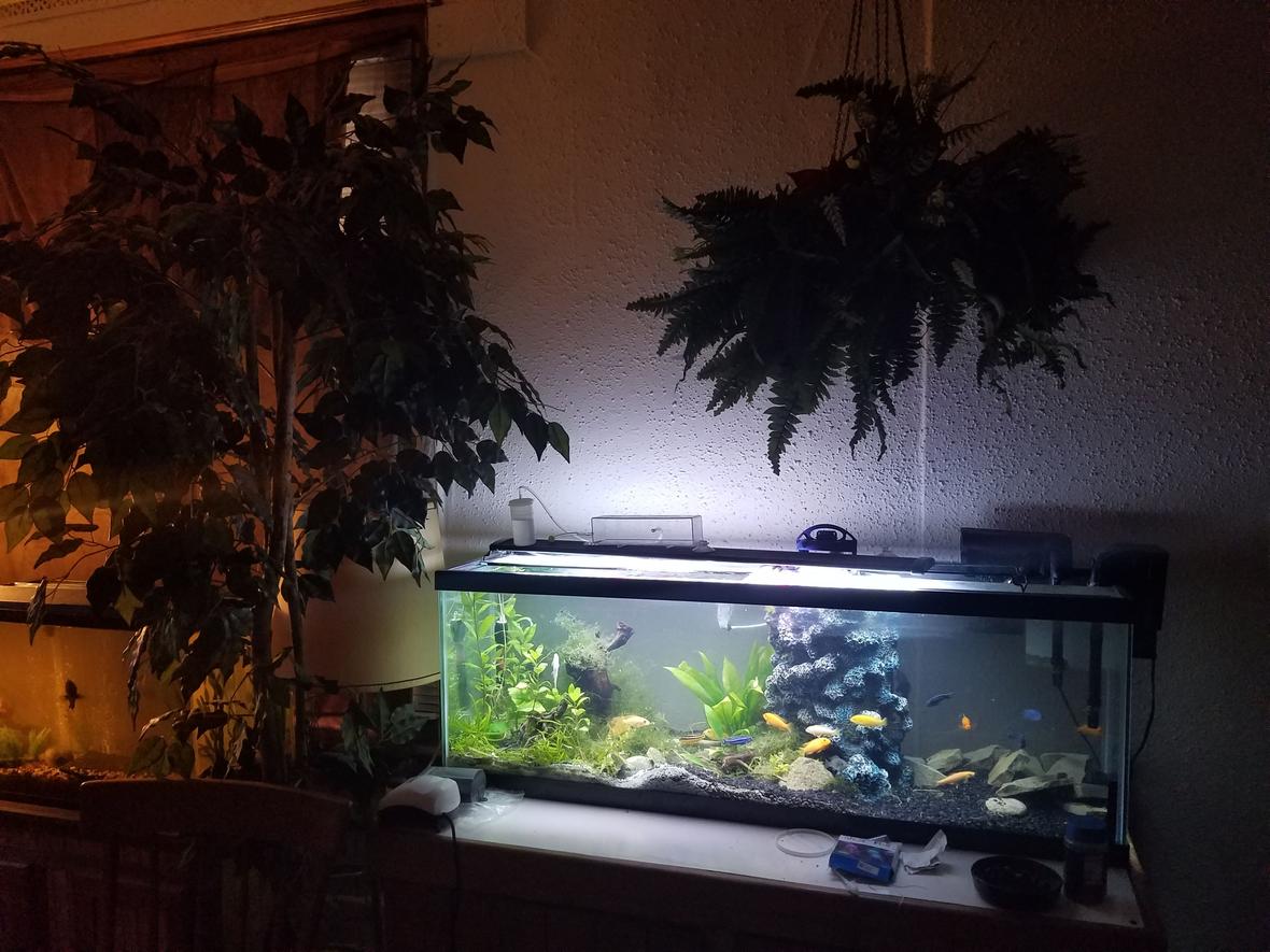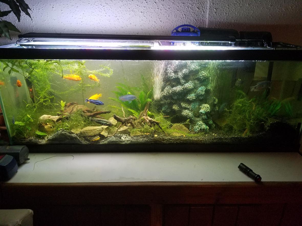 40 gallon long (48x13x17). My "Hawaiian Tank". Right side Hawaiian black lava stone with slate cave work. Left side white Caribbean eco complete sand mixed with black. All natural plants. (Had cloverleaf grass but didn't last but a few weeks. Fish are now working on moss covering driftwood.). Dividing two sides is submersible cliff/waterfall filter. Small whisper power filters make for easy targeted cleaning/current. Bubble stones are placed where current-loving fish reside(like cobalts). A full-spectrum led light provides everything the plants need, and using a 36" provides darker area whenever fish desire. Filled with African cichlids, tank is colorful and infinitely entertaining. The artificial tree and hanging plant completes the look AND feel of the tank.
