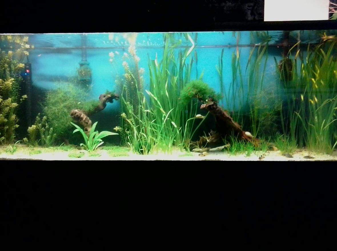 72"L x 18"W x 24"H - glass show tank with one double 4' T from an indoor plant supplier, and one double standard 4' T for a shop. I use 2-Whisper hang on double sided power filters and a small air pump with one small stone. I have been selling my excess Cherry Shrimp back to the same store I started with and they have now paid for a 135gallon upgrade, just switched everything over from the 70gallon.