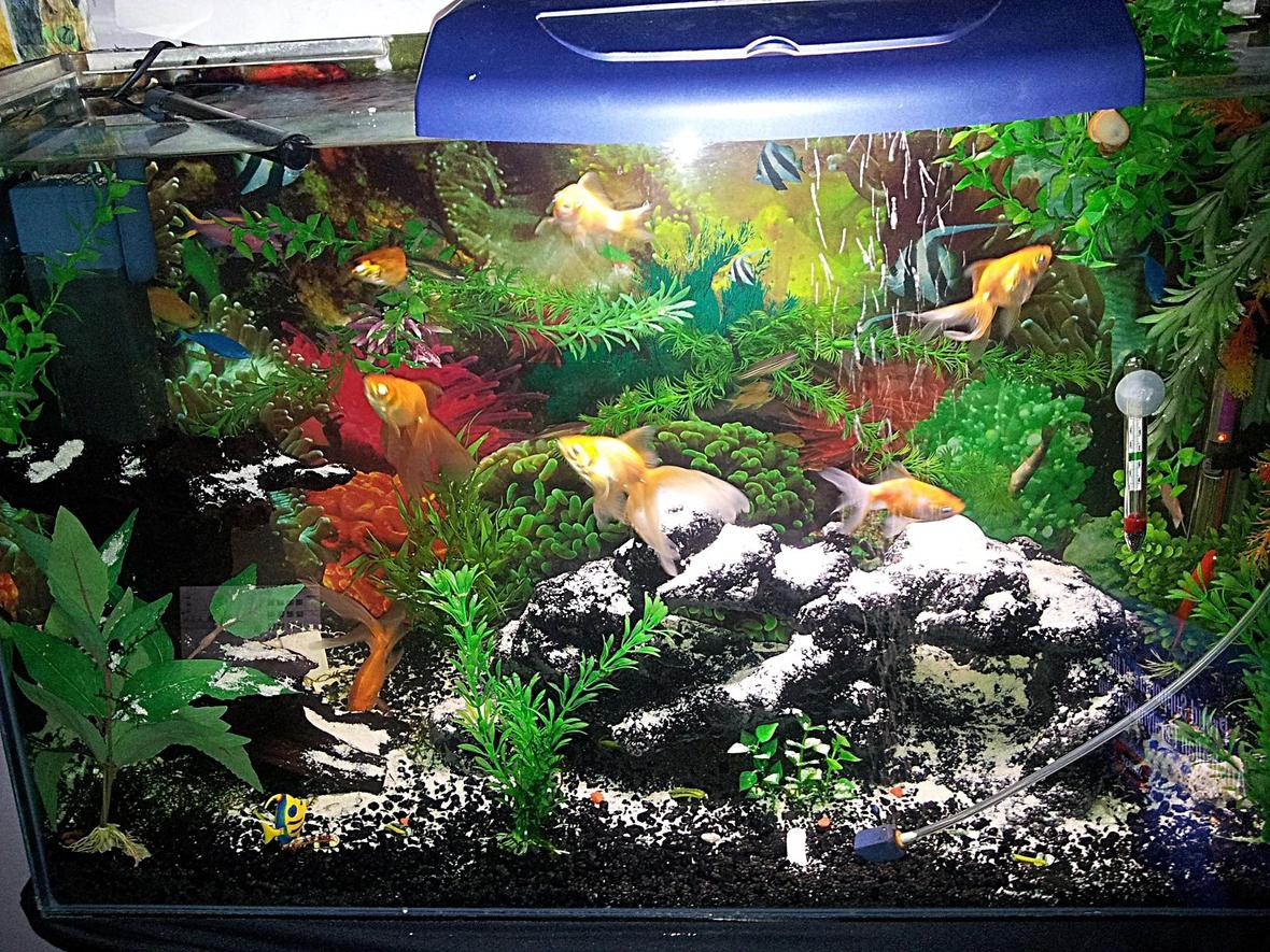 Silver $, Arrow tail, Molly, Chinese algae eater, Bristle nose catfish, 4 Zebra danios, 2 Rummy Nose Tetra, 4 Neon tetras, 7 Gold fish, 2 Apple snail