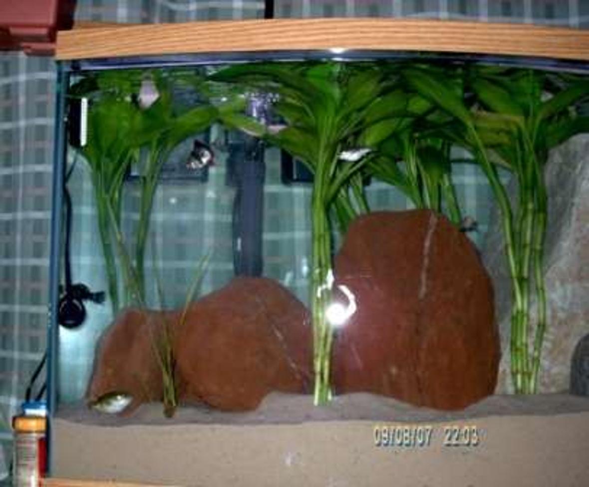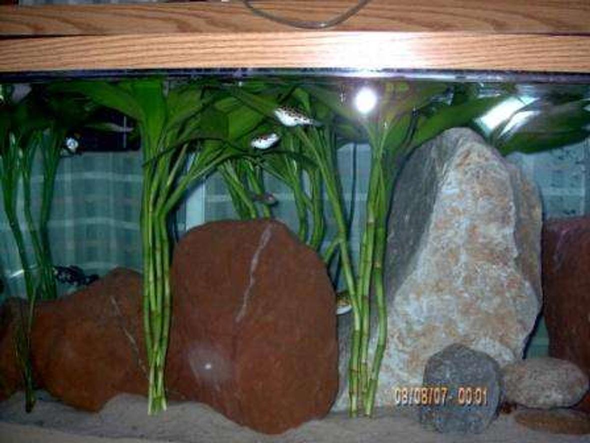 All natural tank. Temperature set at 75deg F. Activated Carbon waterfall filter. Single airpump with air-stone to provide additional circulation. Two 18"overhead flourescent bulbs. Theme: freshwater tank with marine bed appearance (play sand). No soil substrate needed.