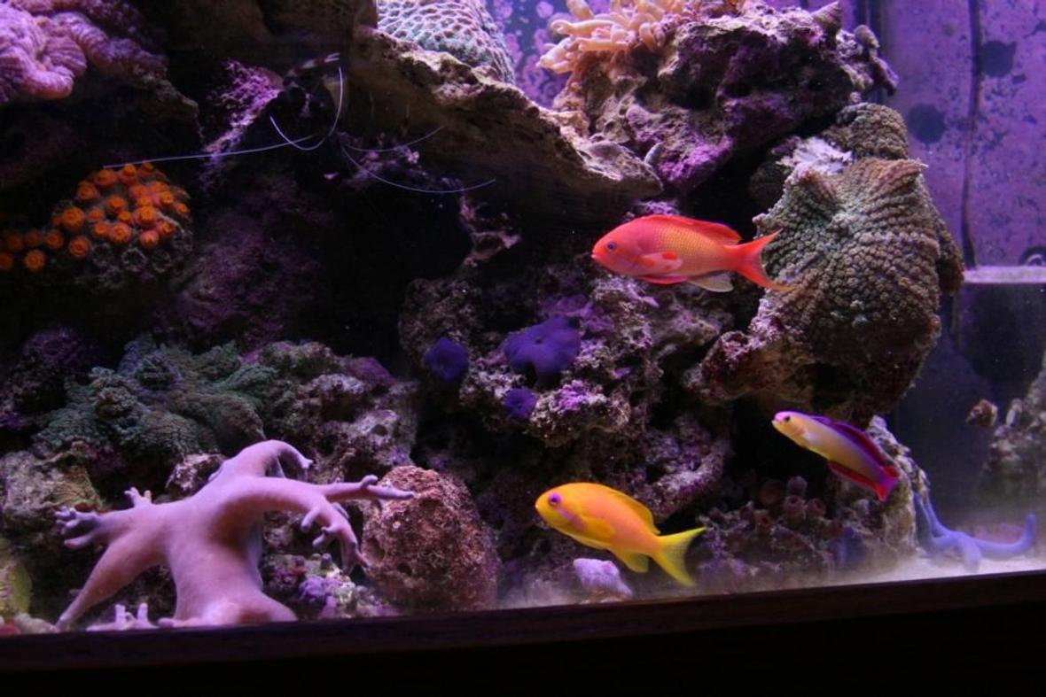 Two percula clowns, on yellow tank, one watchman gobby, one lemon gobby, cardnal, neon cleaner, blood shrimp, coral banded shrimp, blue star, red star, sifter star, scarlet reef crabs, blue leg reef crabs, sally crab, turbos and astors, one giant caterpiller looking thing no idea where it came from.