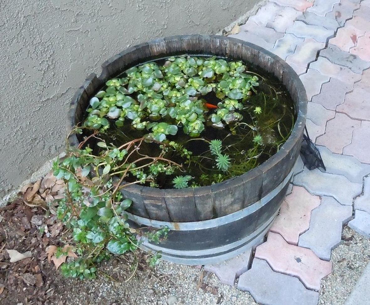 Half a whiskey barrel pond with water hyacinth, parrots feather, primrose creeper and anacharis