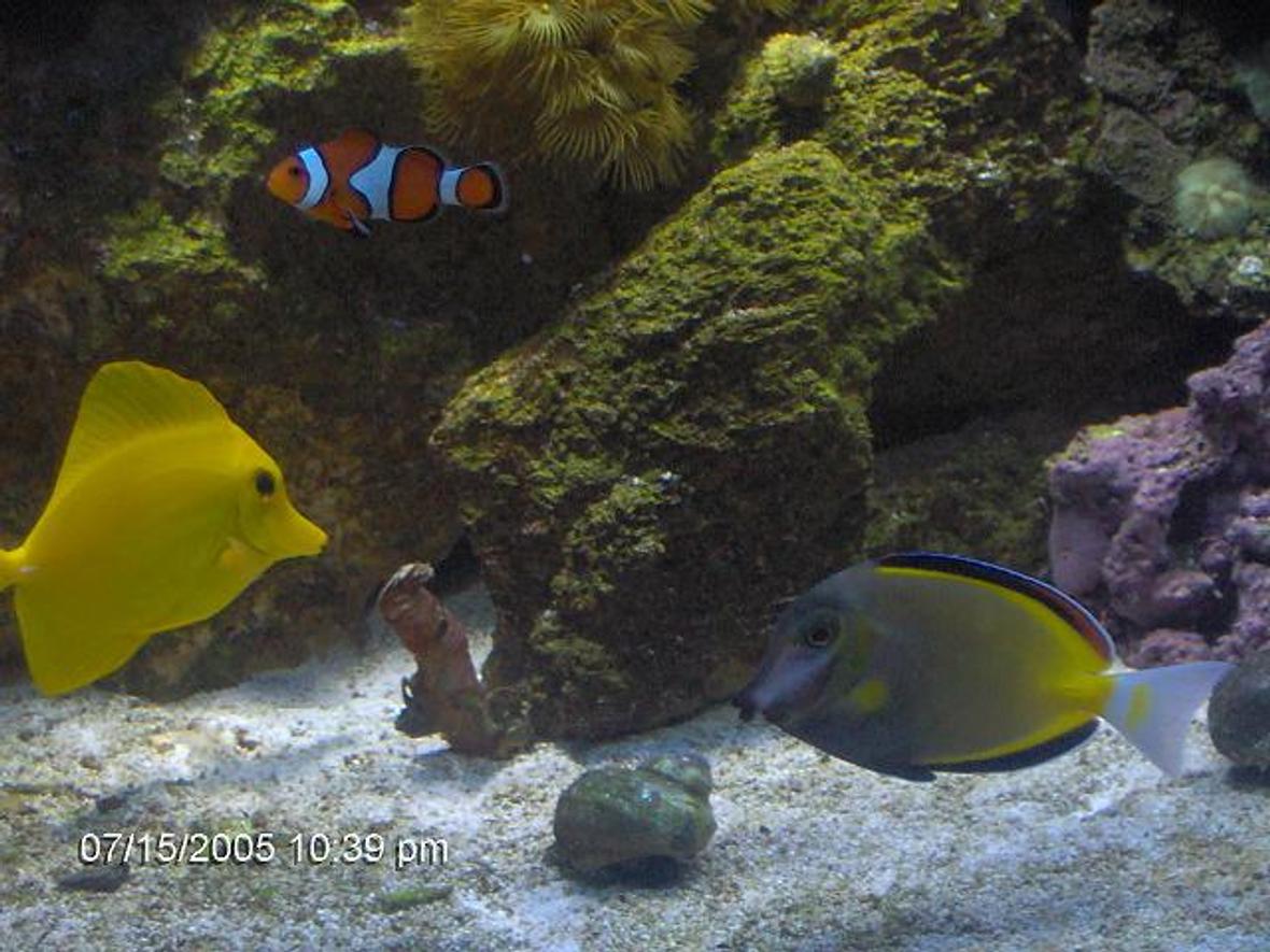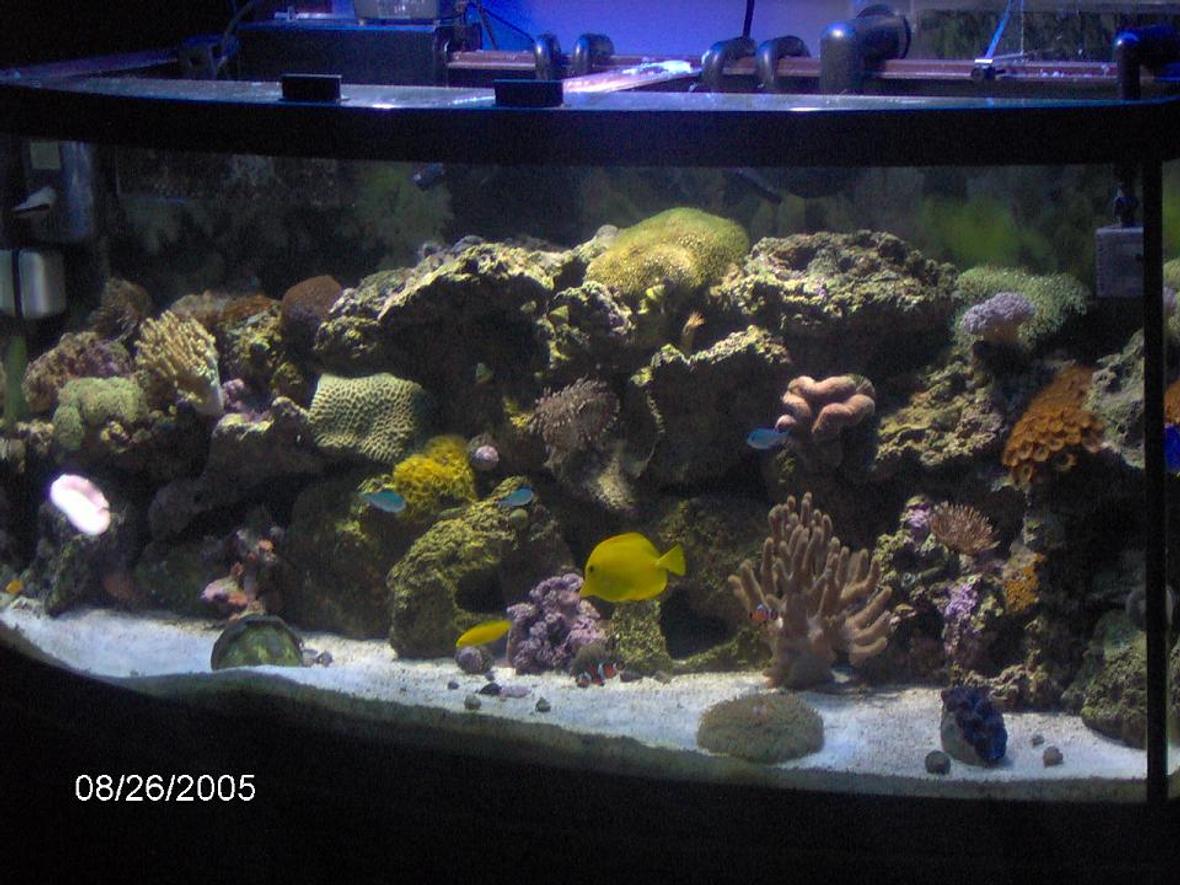 72gal bow front Saltwater fish & reef tank. Yellow tangs, Clownfish,brown powder tang, cleaner shrimp.snails, hermit crabs. Ther is also Star polyps, Green Brain ans other variety of corals.