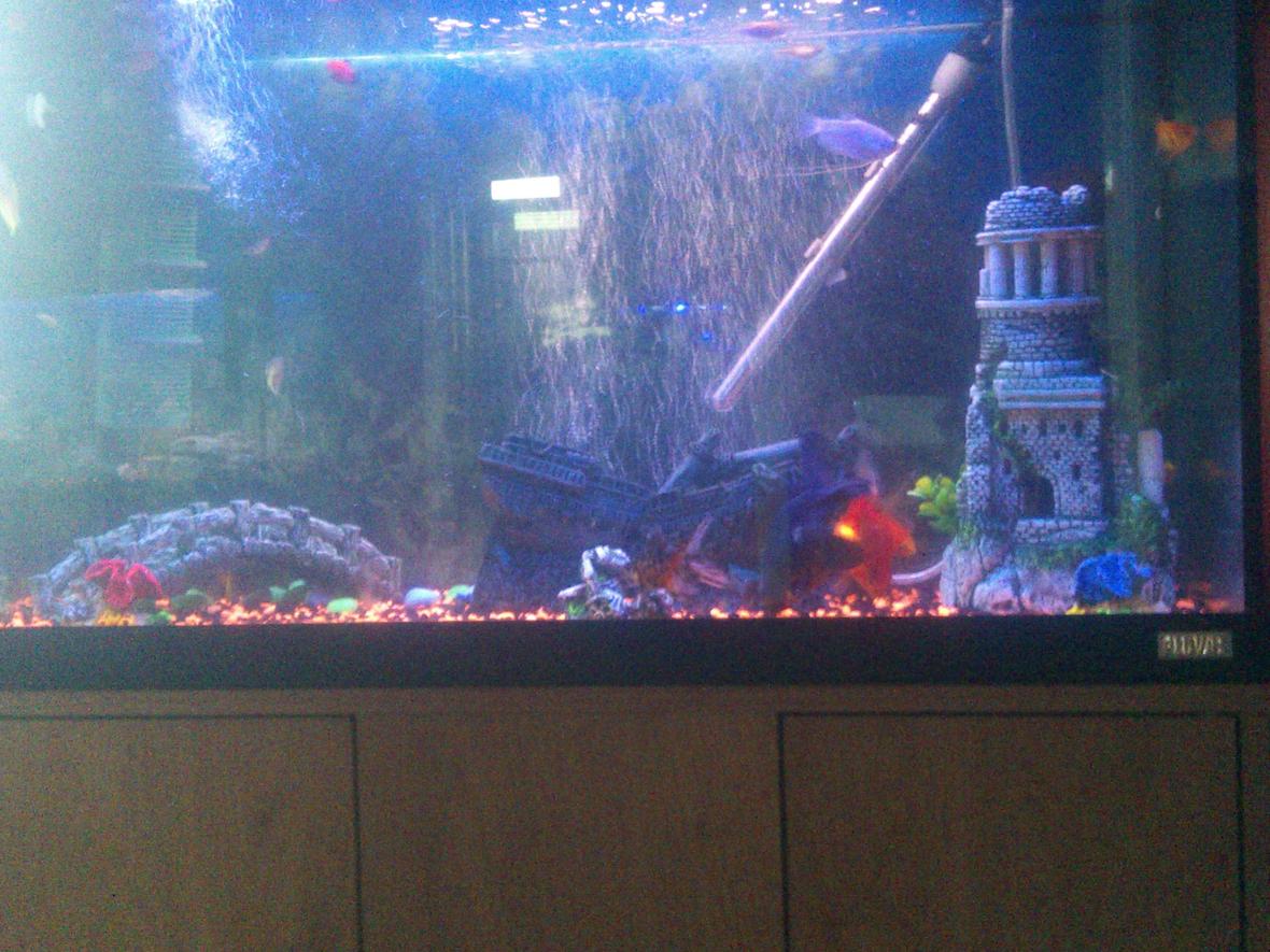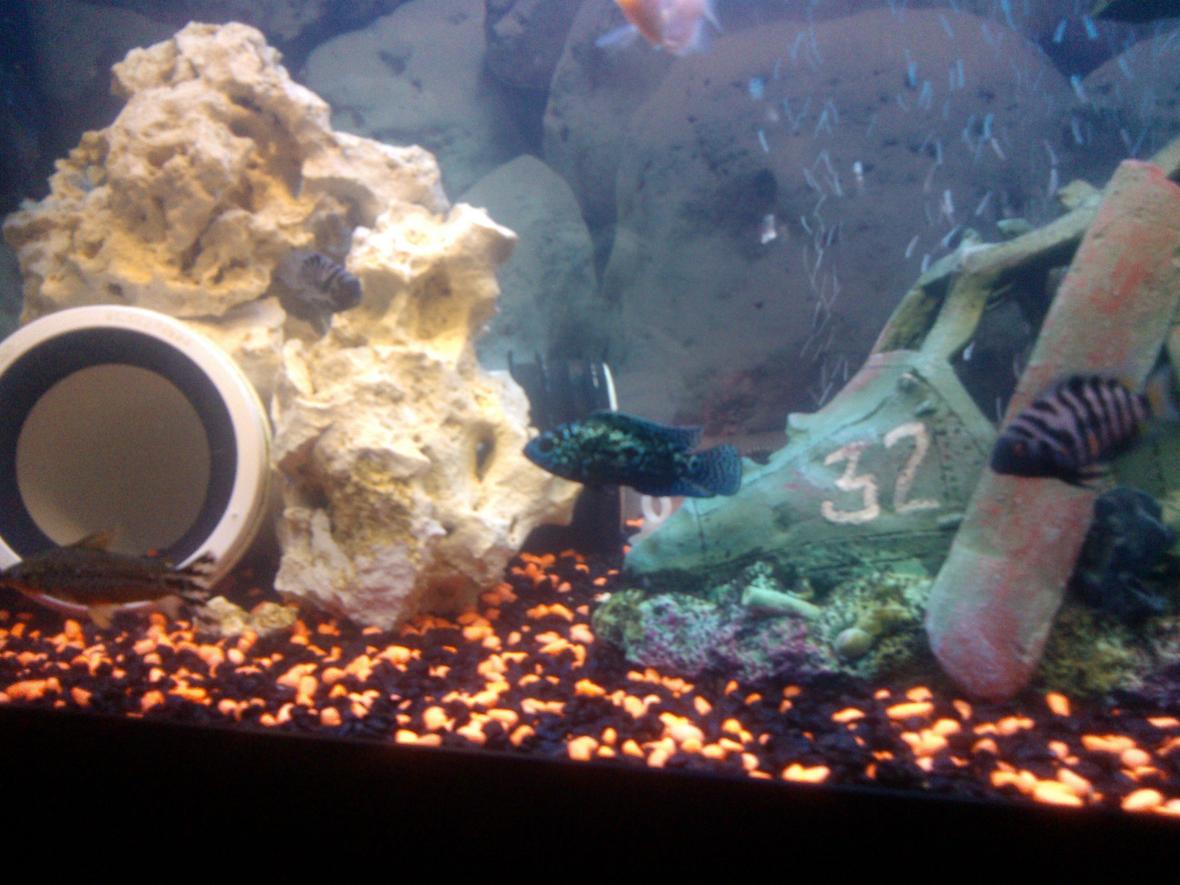 65 gallon tank with gravel and a helicopter in the middle and a pvc pipe with coral rock on the topand side of the pipe. air stone at the back of tank. lighting is 1 blue marine and 1 pink colour glow light.