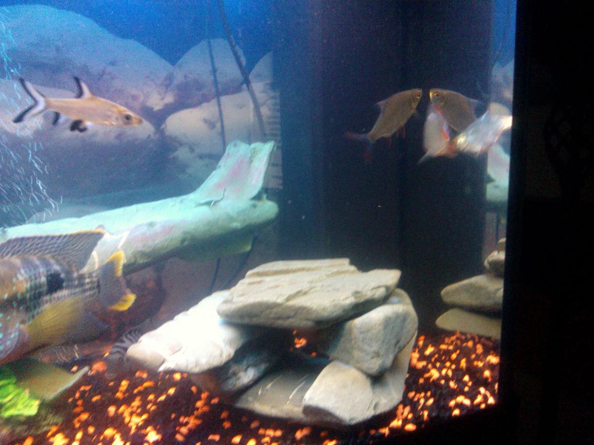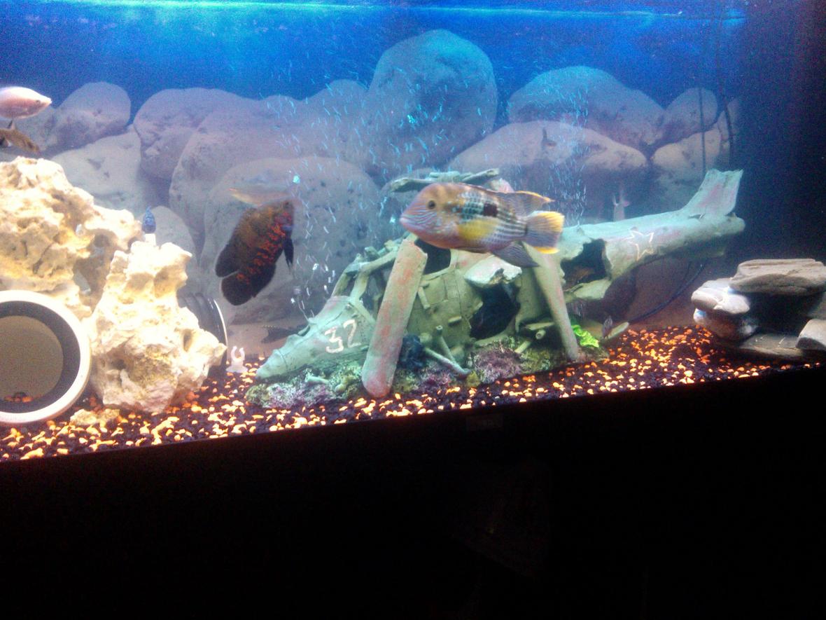 Decided to make a few changes to the tank. 1 albino Oscar, 1 tiger Oscar, 2 bala sharks,2 orange parrots, 2 firemouth cichlids, 1 silver dollar,3 tinfoil barbs, 1 female convict,2 clown loaches, 2 upside down catfish, 2 pleco's, 1 gold severum. Pics to upload and change