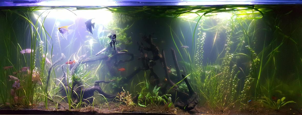 100 gallon, 5 foot planted aquarium. I use shop bought springwater in my aquariums. The aquarium gets lots of natural sunlight from all sides. If you plant heavily, you will not have an algae problem or a nitrate problem. When you plant, leave the plant to do its thing. Fussing with it impedes growth and root establishment. From 5pm to 9pm, the aquarium lights are on. They are full spectrum that I keep to a low setting.
