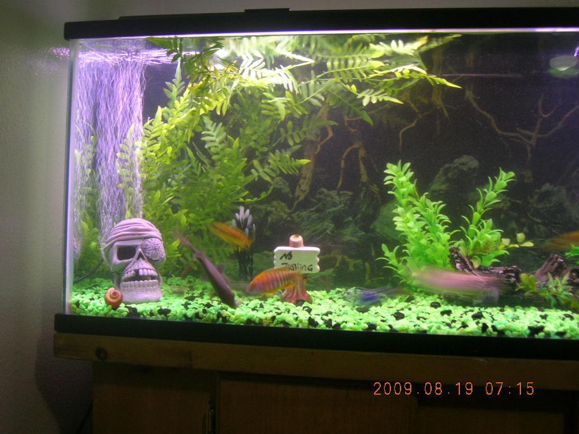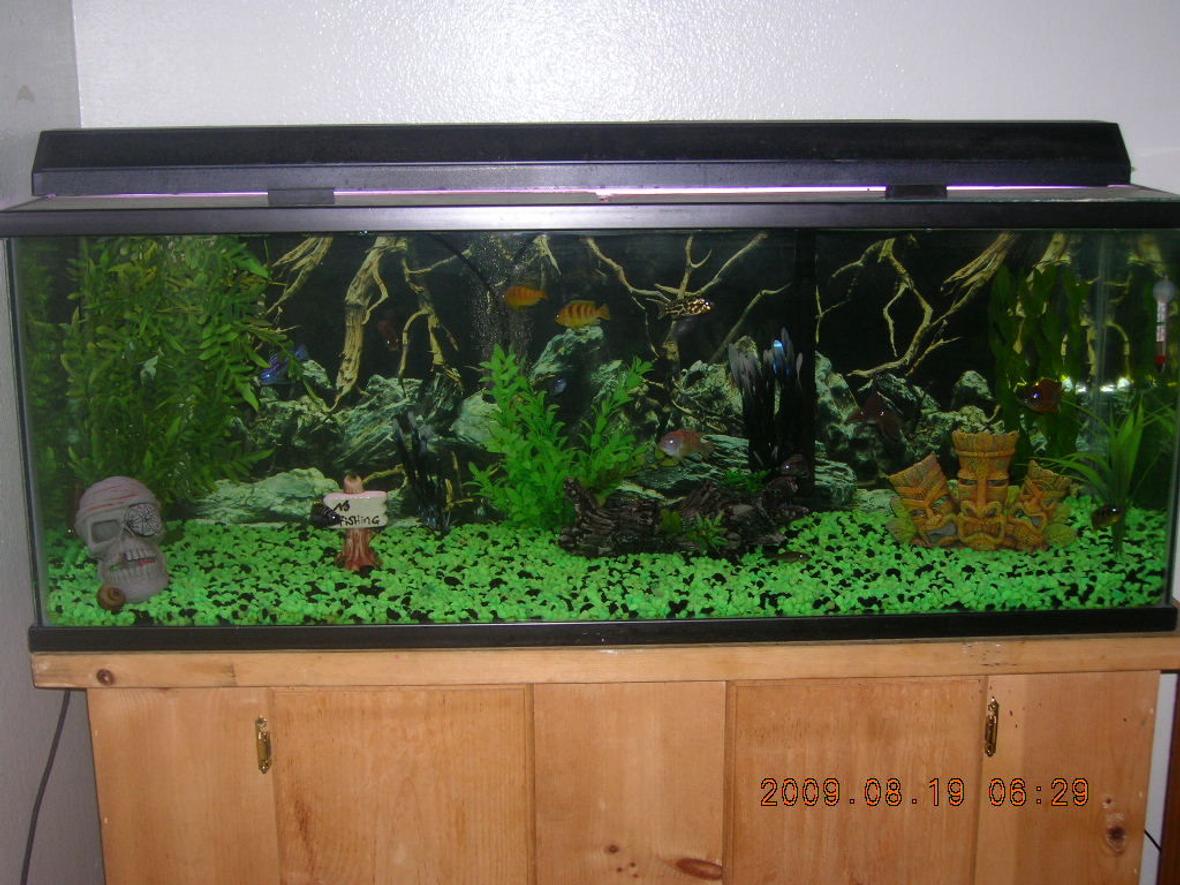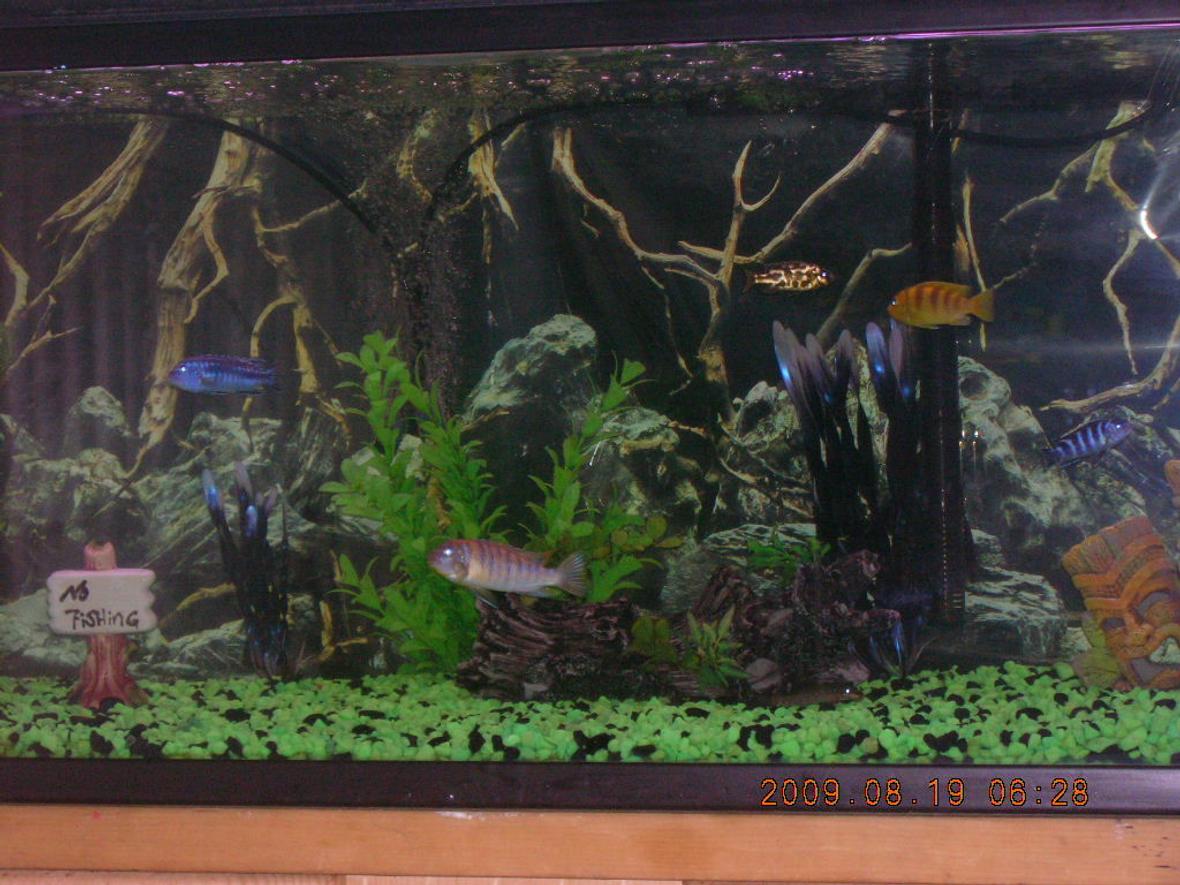1 electric blue johonni, 1 peacock, 2 bumble bees, 1 south american black convict, 1 jack dimpsey, 1 powder blue jack dimpsey, 1 red belly pacu, 1 black shark, and a few other assorted african cichlids that I can't remember the name of,that i bought because of either there beauty or there aggression.