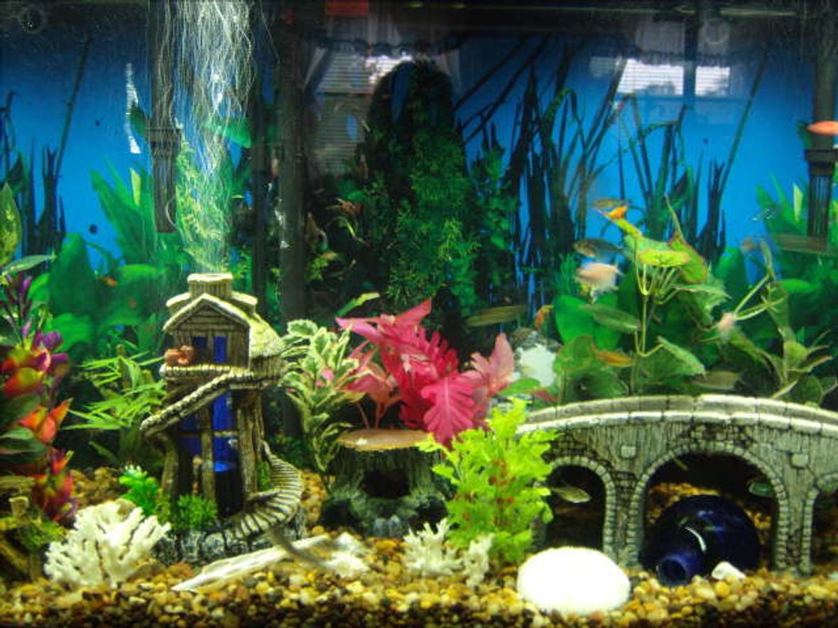 I have a mix of artificial plants and live plants along with bridges, huts assorted shells and white coral and natural stone for the bed.