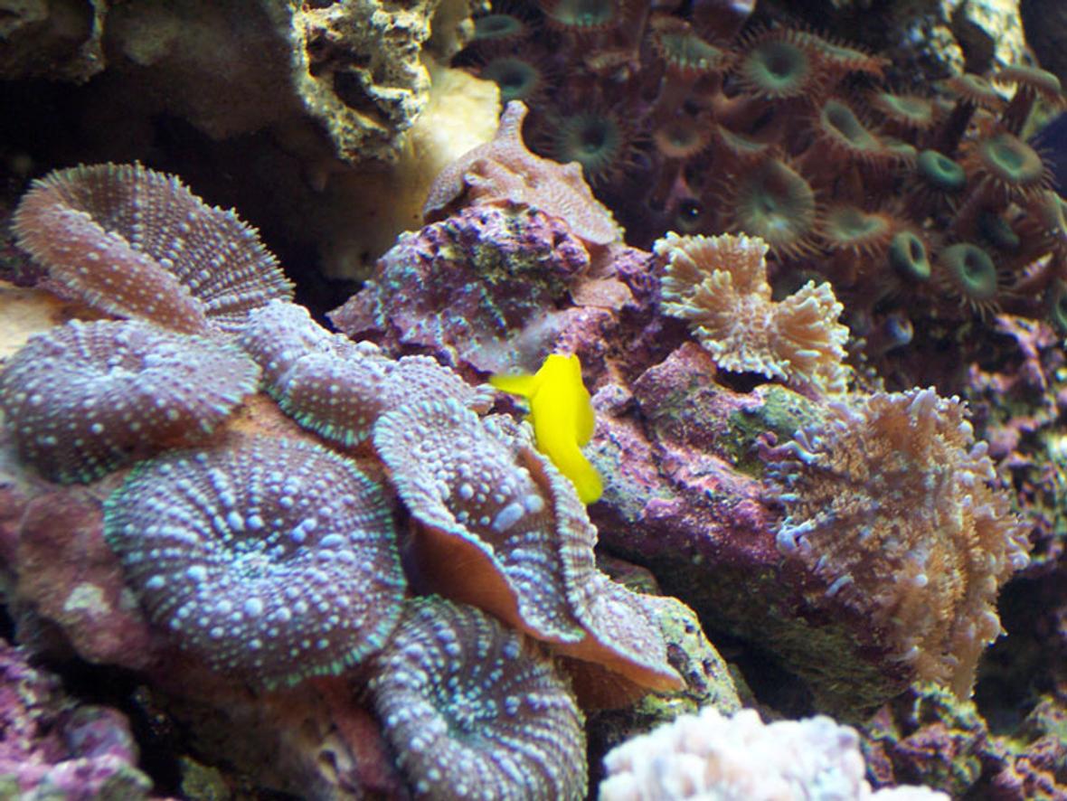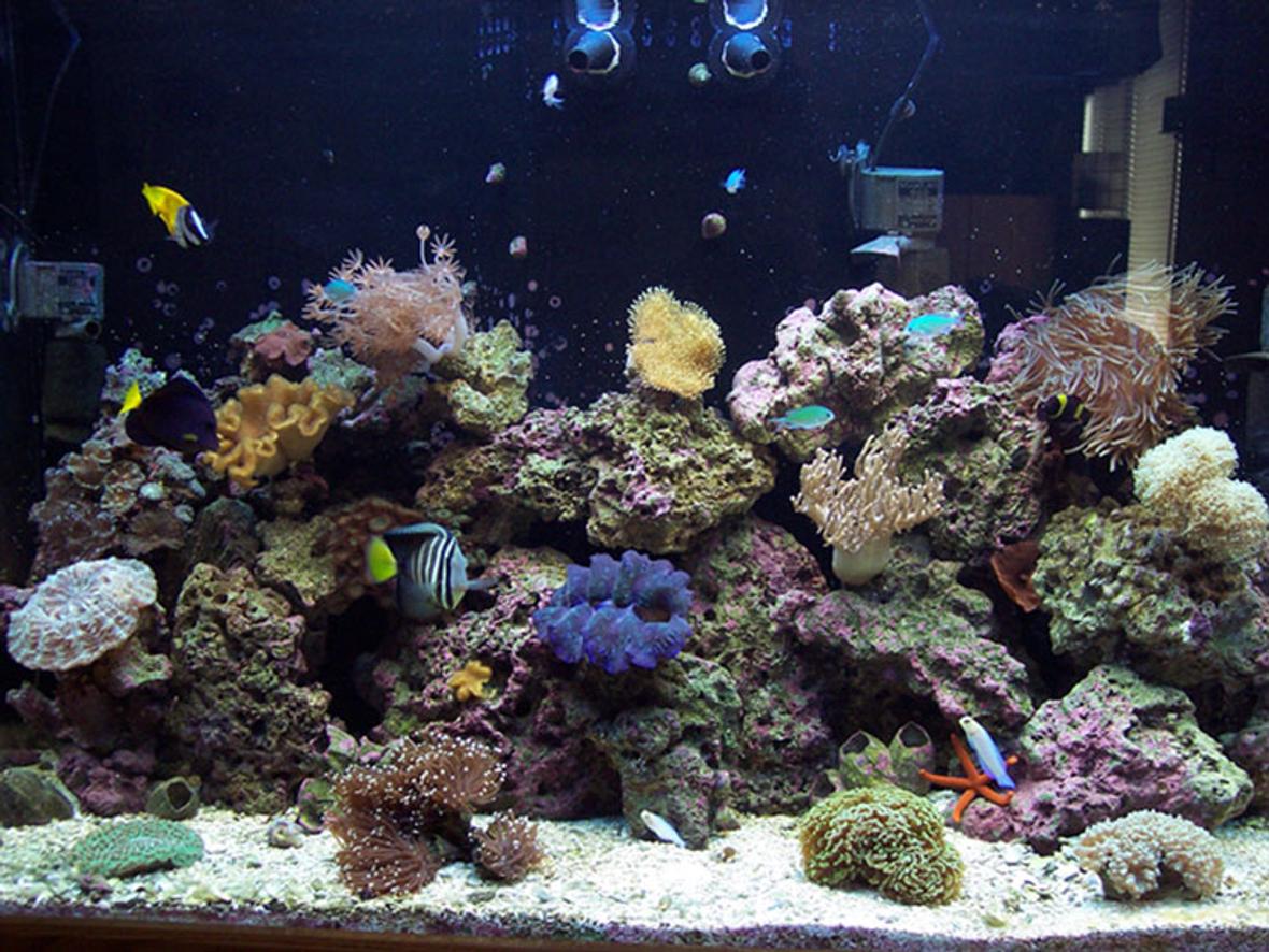 I have a custom acrylic 120 gallon reef. It's on a custom oak stand with matching canopy. Inside the canopy I have 8 Power compact lights, 2 VHO flourescents and 1 moon light. I have a 40 gallon refugium underneath and a 20 gallon sump with a G3 Protein skimmer. Over 150#'s of live rock.