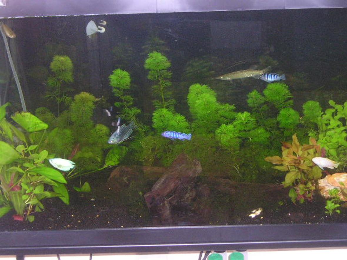 1 opline gourami, 4 various african ciclids, featherfin knife fish, pleco, a baby silver gar
