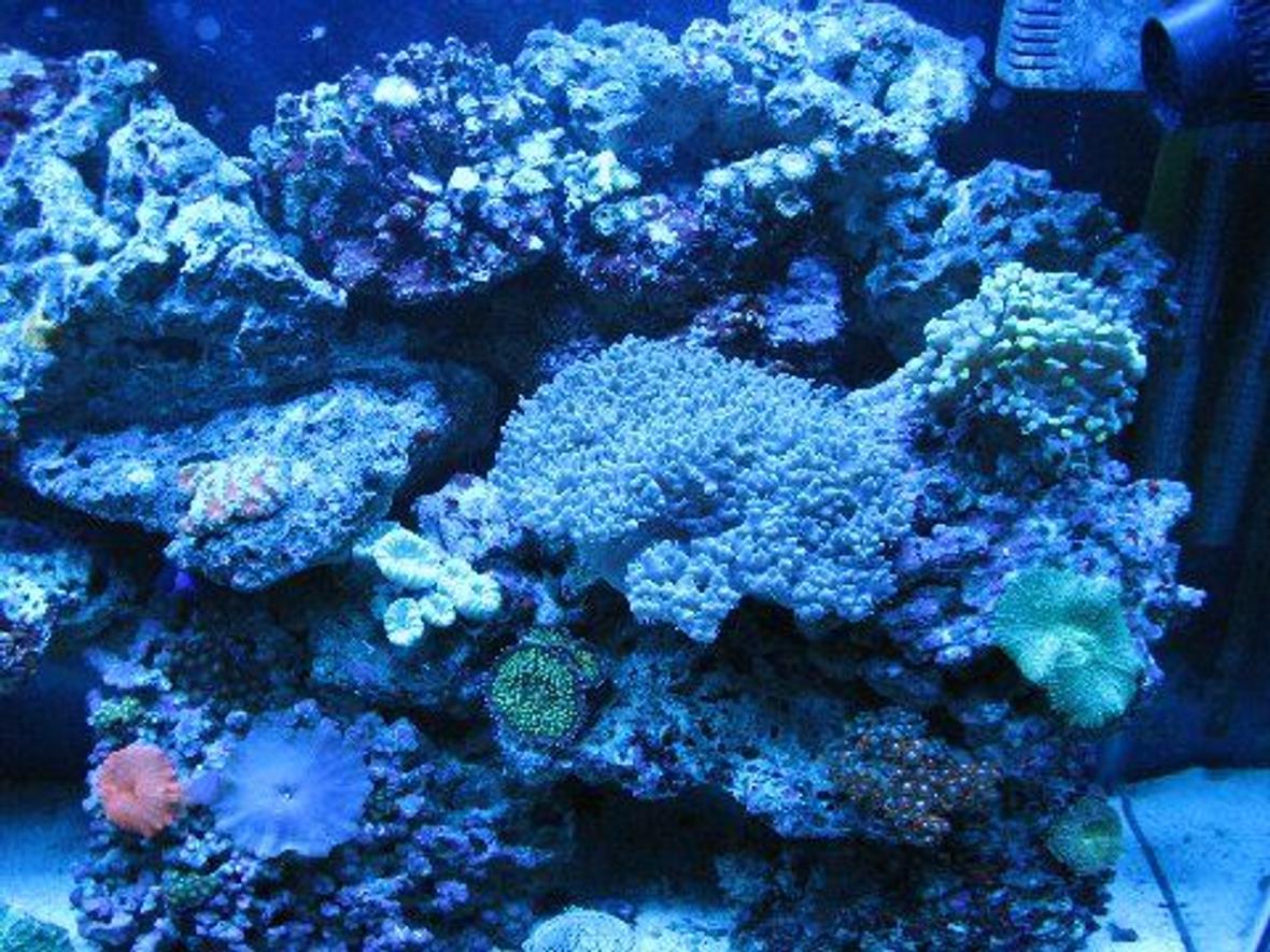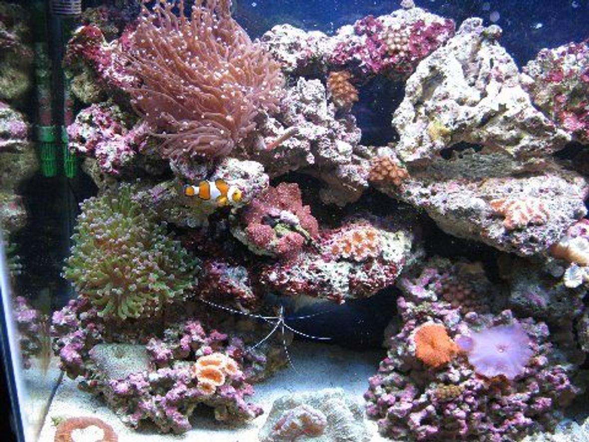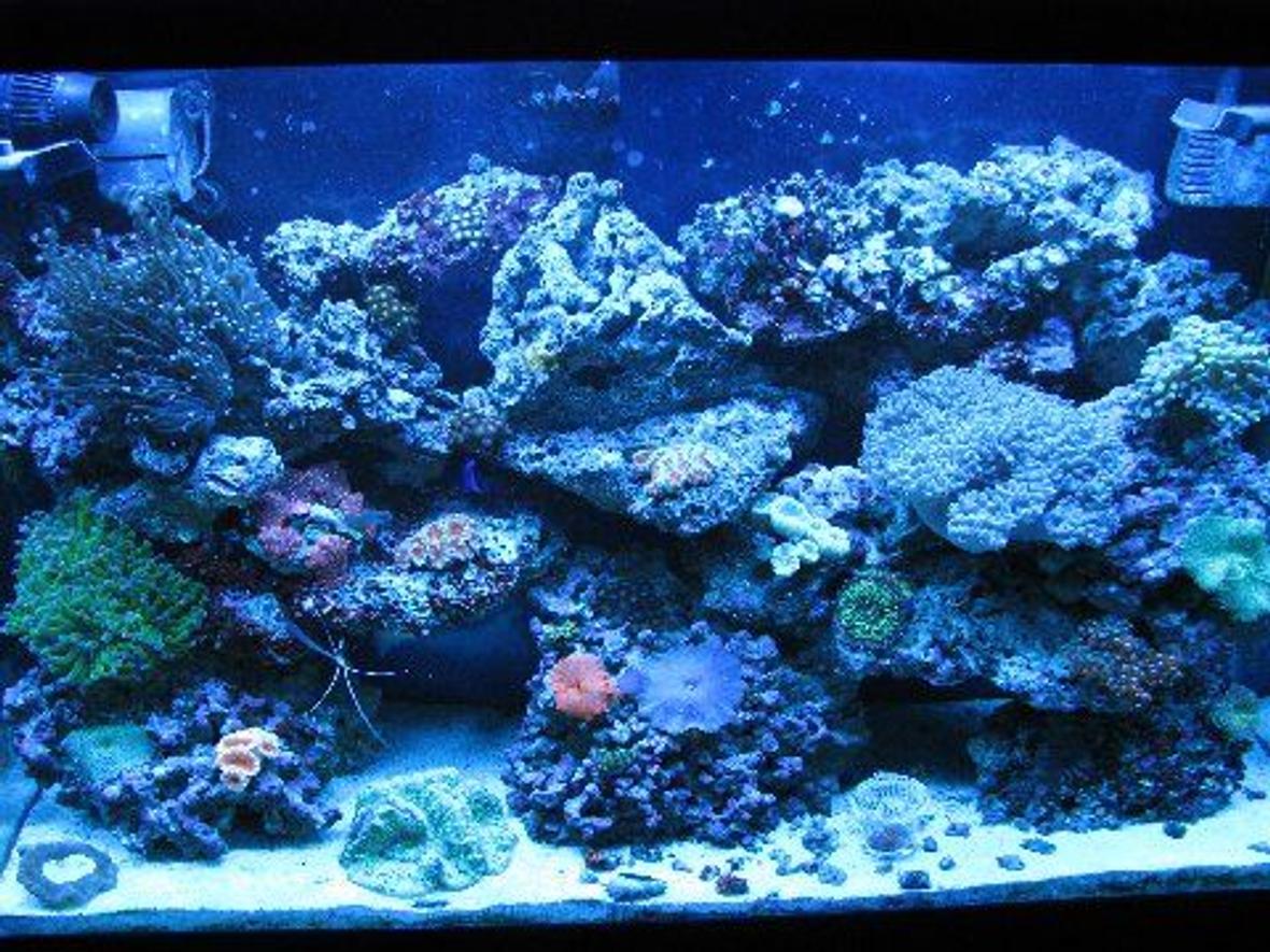45gl It's only the begining can't wait till it's all filled up slow and steady. Cpr refugium, pc lighting upgrading to t5's soon, couple of power heads, ehiem cannister for water movement behind rocks only run carbon and filter floss in it , water change every 2 weeks