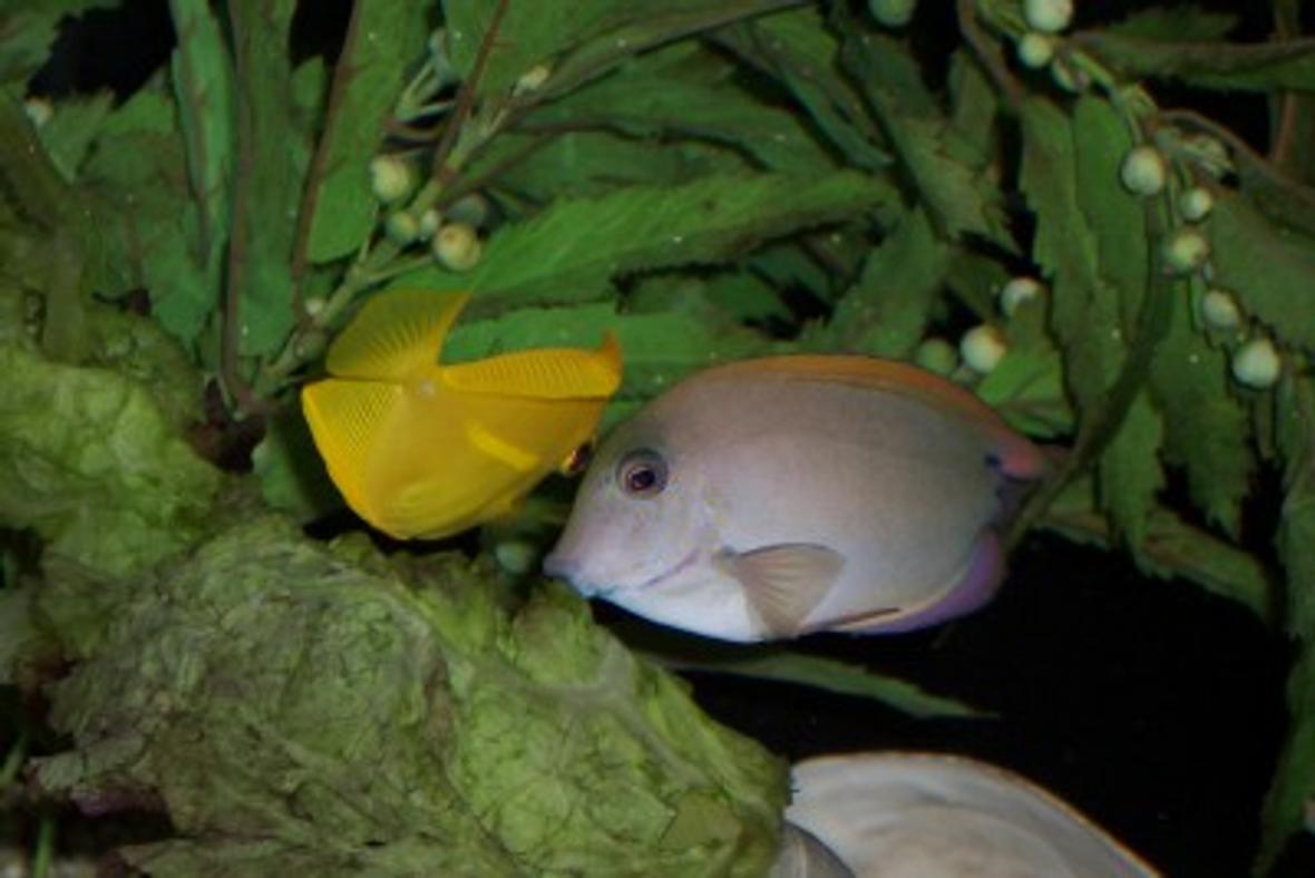 Our lavender tang getting cleaned by our cleaner shrimp.
