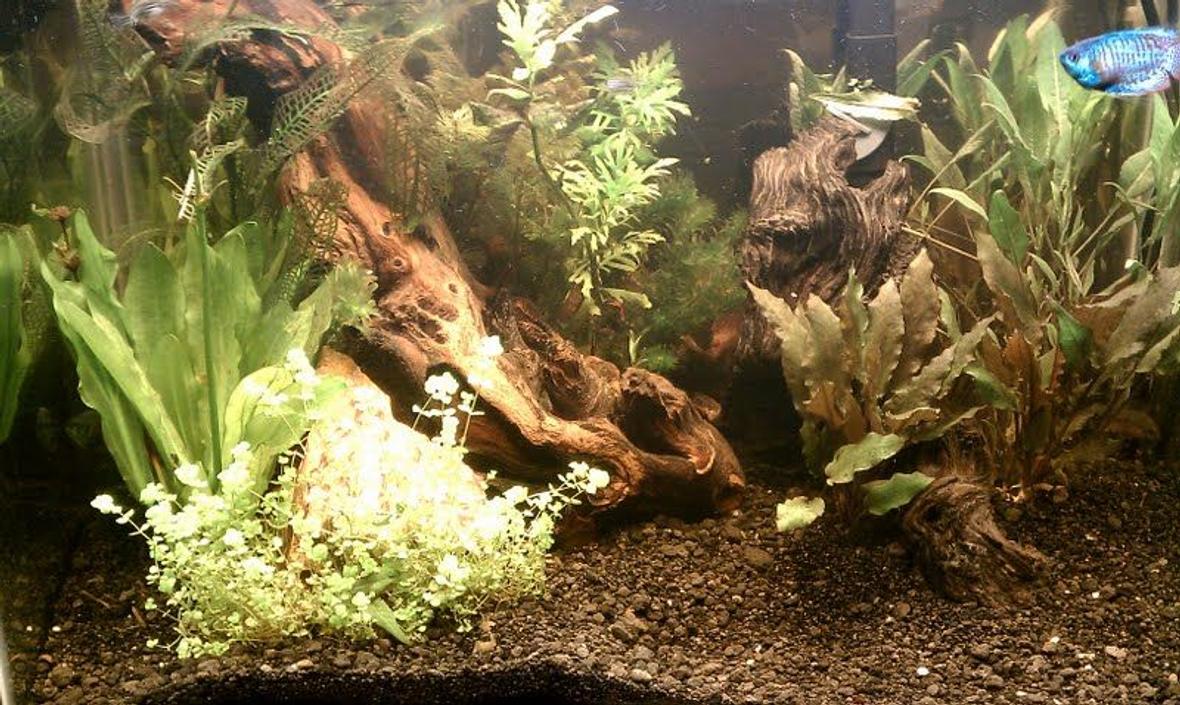 Natural 20G is heavily planted, withsome dwarf gouramis, blue rams, and other small tetras with driftwood and Eco-Complete substrate for planted aquariums. It's running a Bio-Wheel 200 and a 50w Pro Stealth heater. The lighting is a Coralife reflector fixture with 2 T5HO, GLO Life-Glo bulbs(they're awesome for the plants). Driftwood is still leaching a little, but I like the effect.