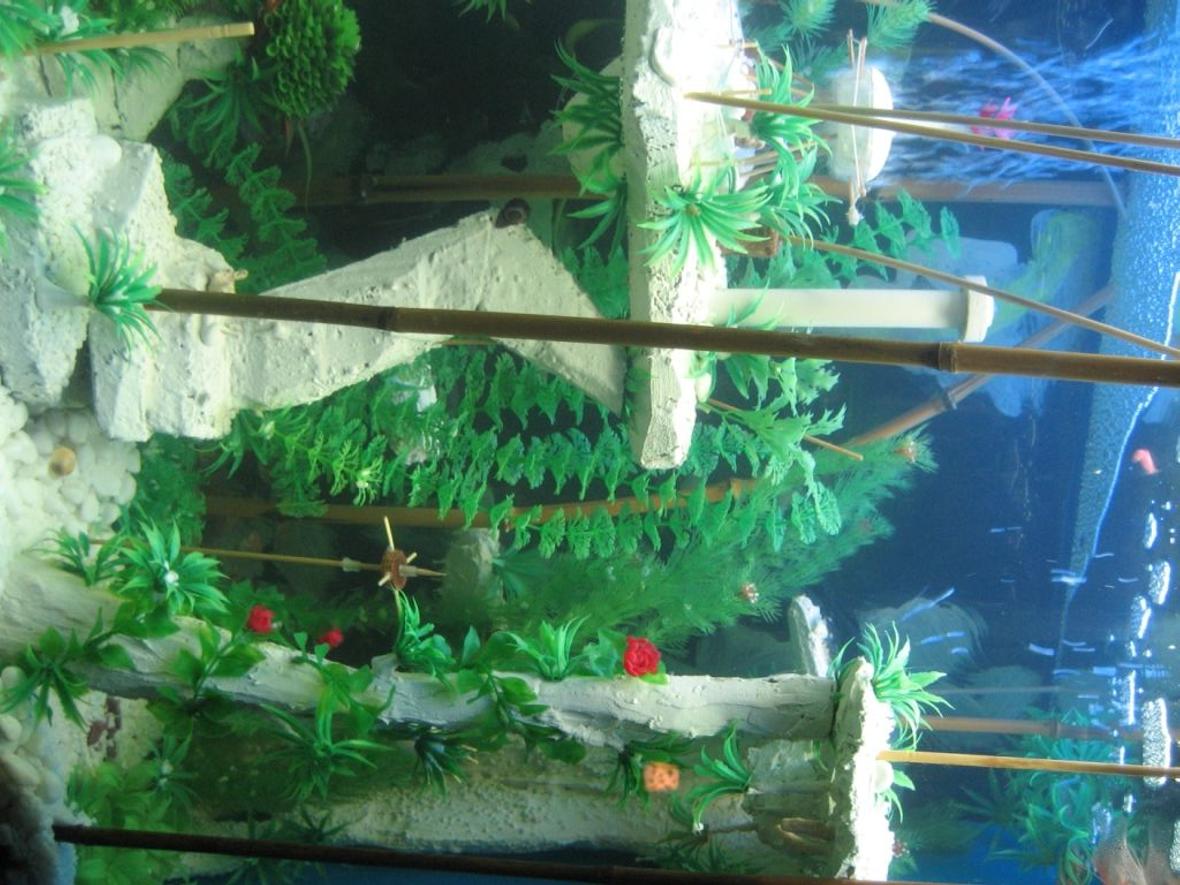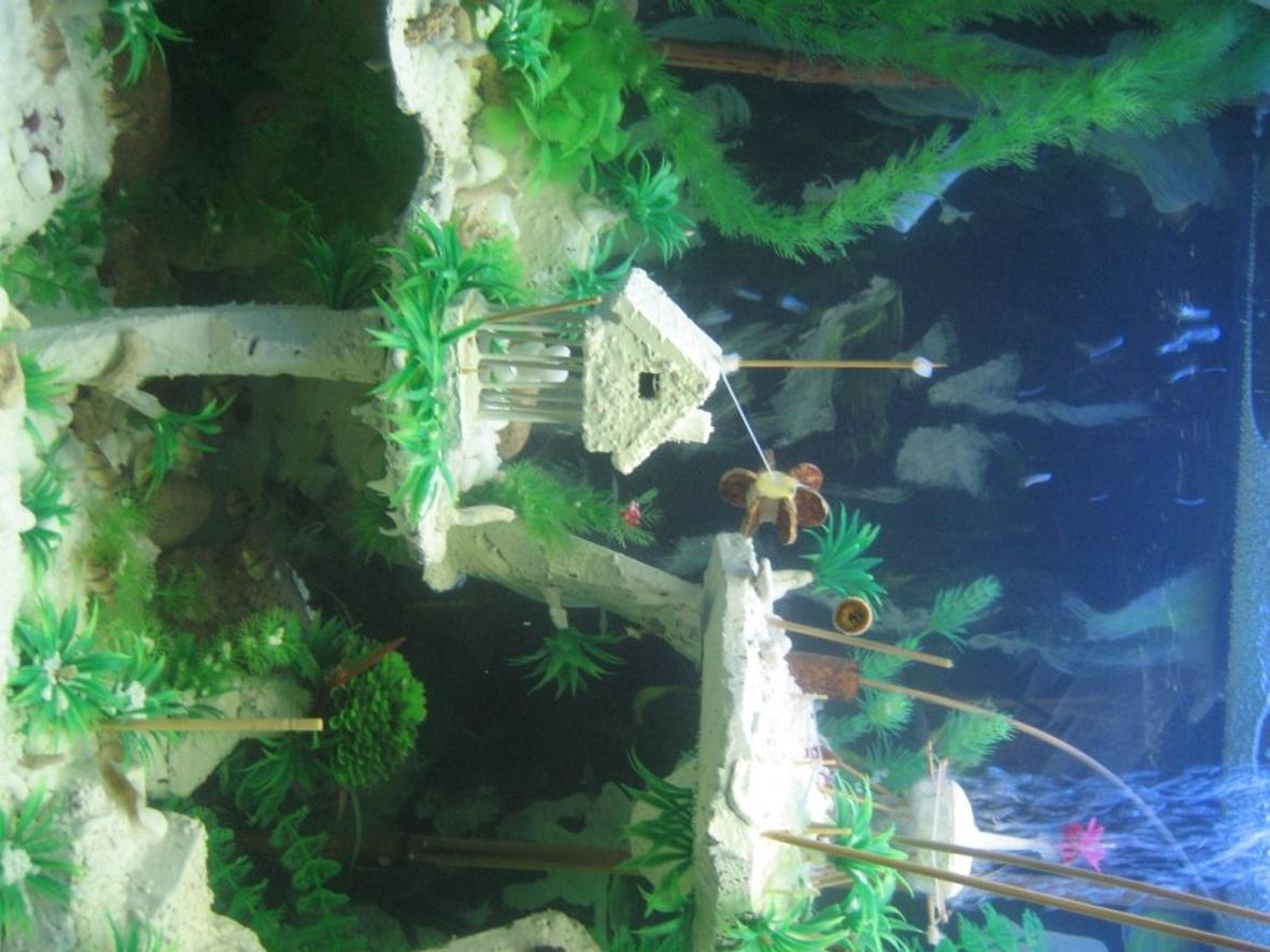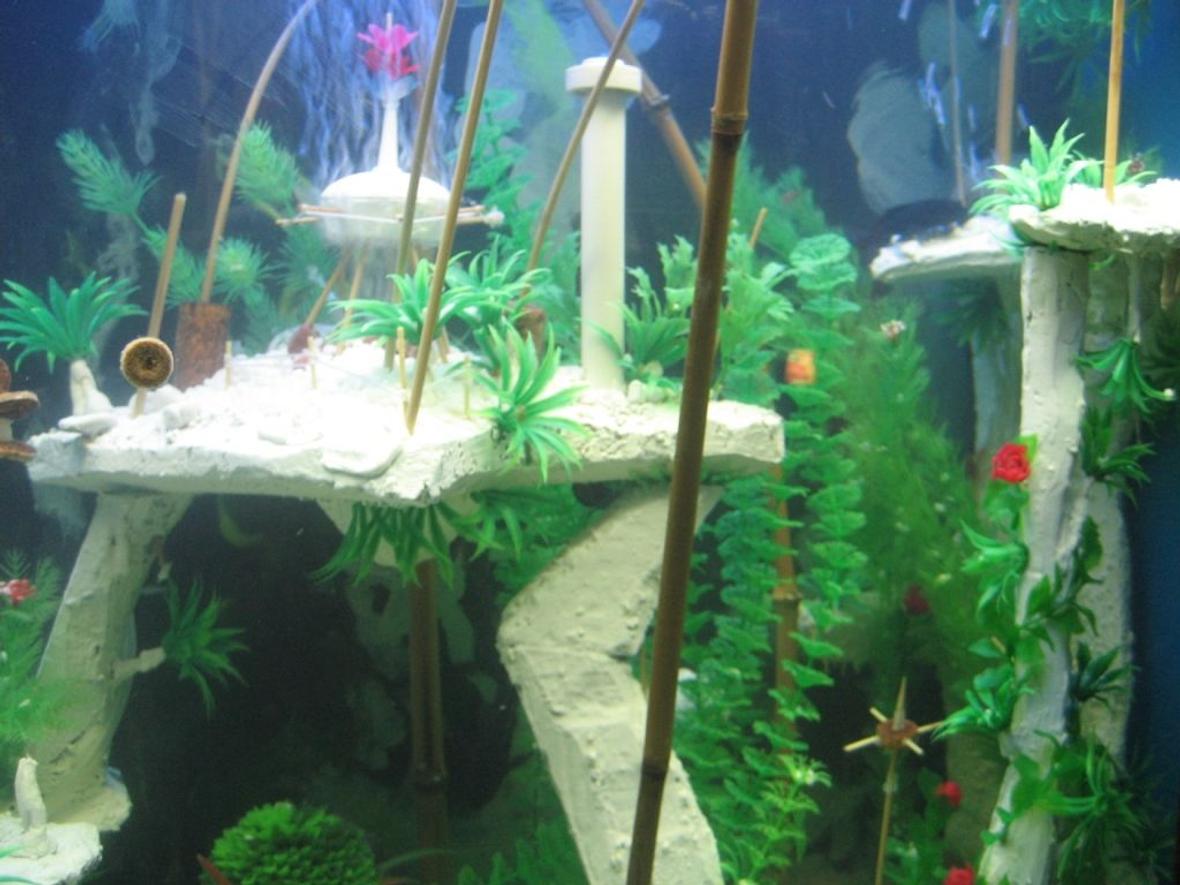 the 80 gallon fish tank contsins a handmade (carved sandstone) landscape with several buildings. A “glowing in the dark†painted background, which simulates volcanic eruptions and some deep sea “black smokerâ€
