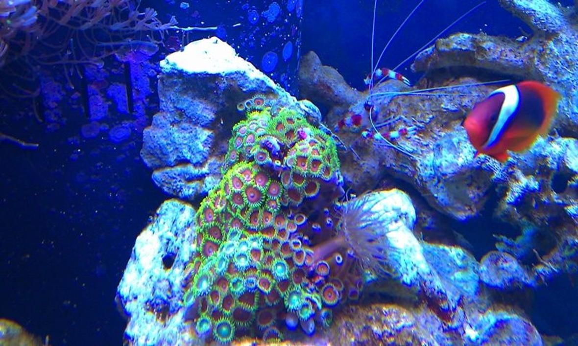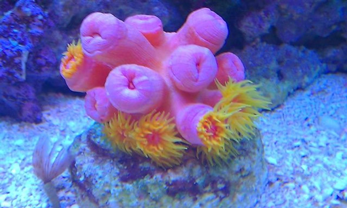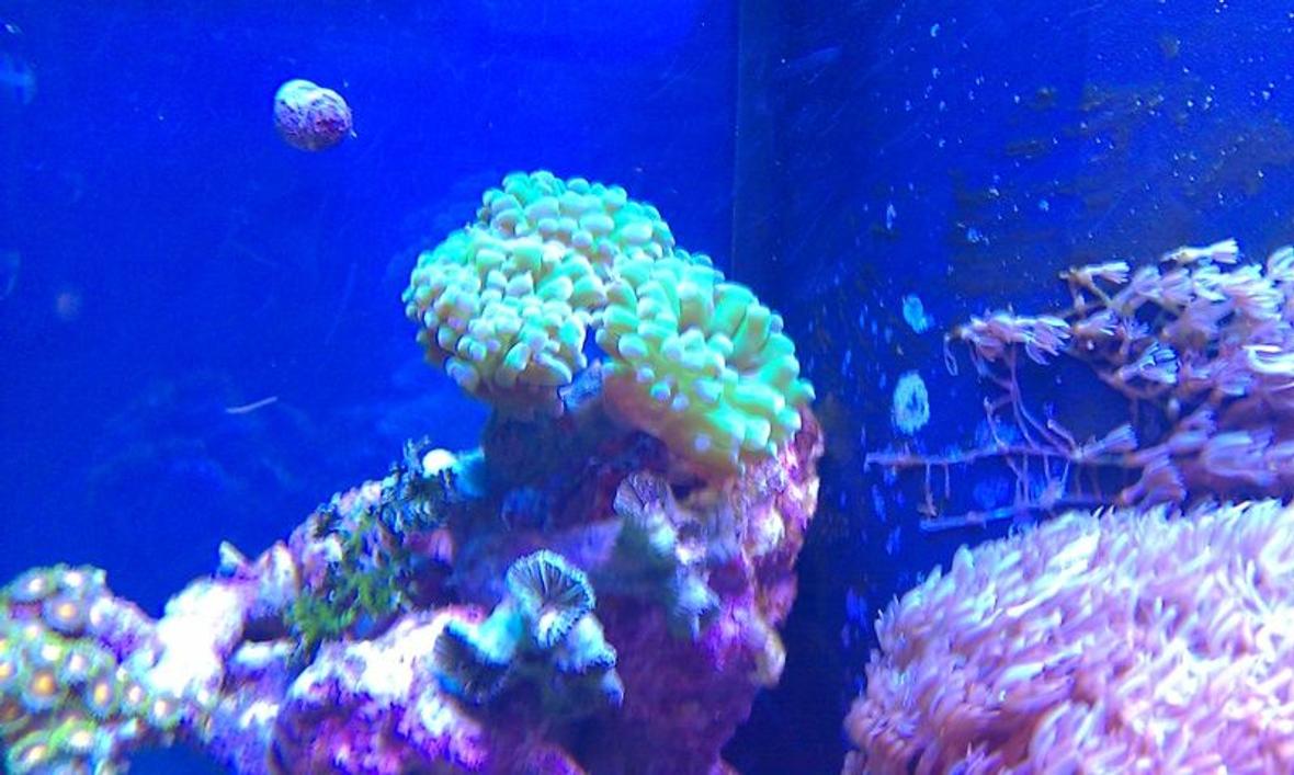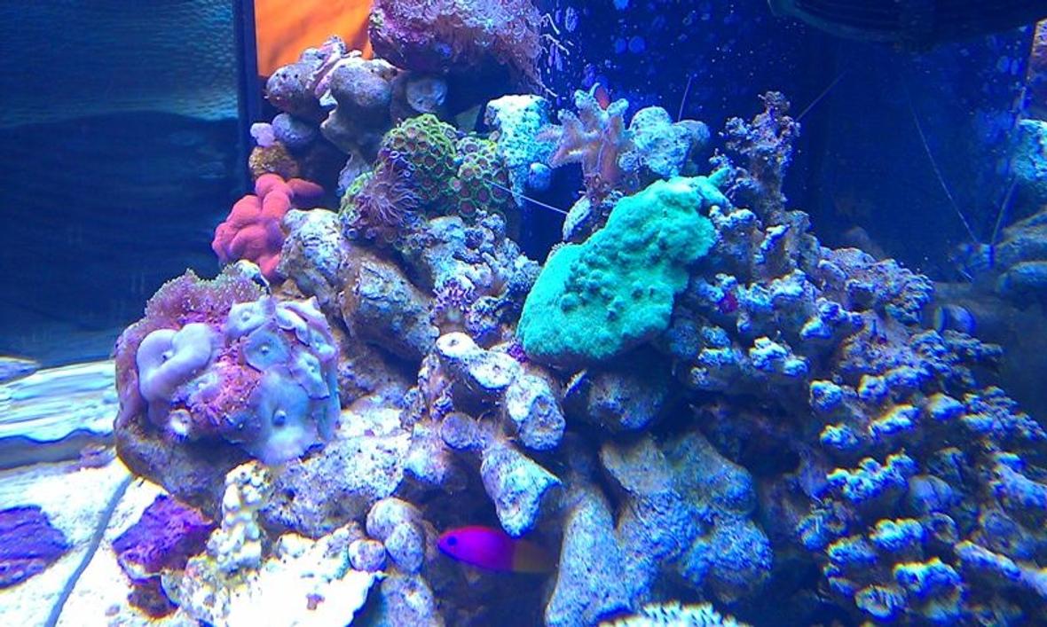 giant leather toadstool, green montipora, red Lobophyllia, frogspawn, orange sun coral, yellow sun coral, metallic green flowerpot, daisy star polyps, xenia coral, blue mushrooms, green hairy mushrooms, orange mushrooms, green zoanthids, orange zoanthids, green favites brain coral, plate shelf coral, yellow scroll coral, blue maxima clam.