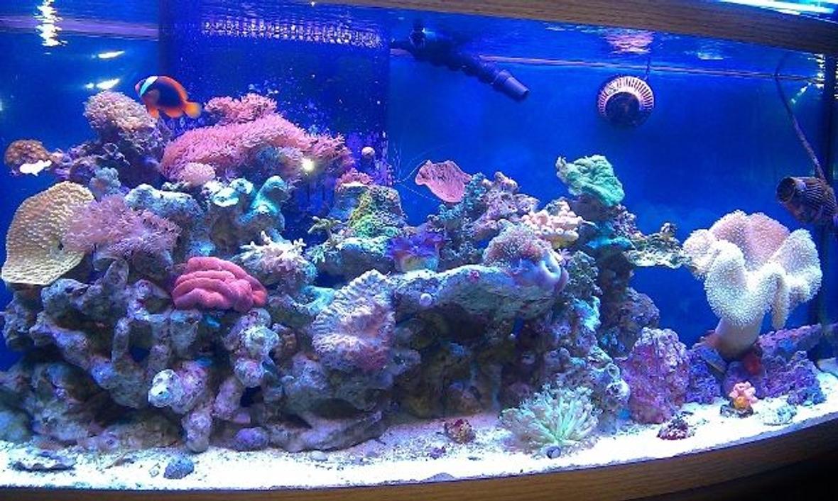 72 gal bow front with 20 gal sump tank. Coralife 225 super skimmer, 700(gph) supreme classic mag drive submersible pump, BRS GFO raactor, Coralife Turbo Twist UV Sterilizer: 12x - 36Watt - 500 Gallons, 1 double and 1 single GLO T5 HO Linear Fluorescent Fixtures with 1 white, and 2 blue t-5 bulbs, 2 Hydor Koralia Evolution 1050 gph powerheads.