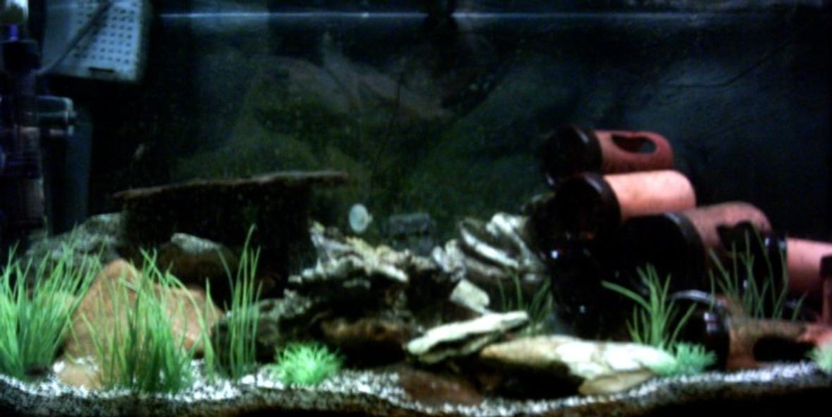 large to medium gravel, river pebbles, sand stone slab, strawbeyy planter pot, budda head, barel, plastic plants, 2x 1200lph ex-filters, 2x 250w heater with plastic covers, 1x 1200lph powerhead, 1 day light, 1 morning light.
