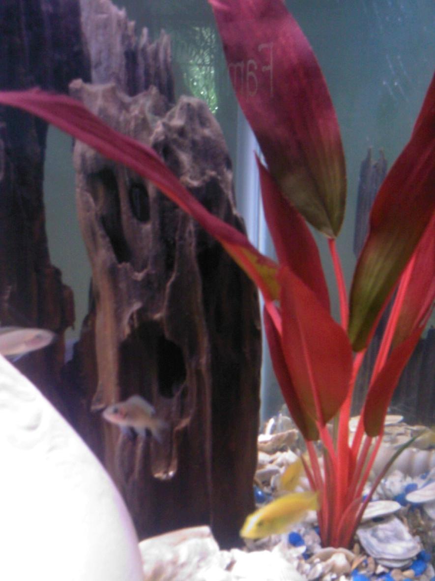 Got a 29 gallon tank from a friend and turned it into an African Cichlid tank. I used some crushed shell mixed with blue aquarum stone, embellished it with some driftwood cuttings mounted on acrylic, some fake silk aquarium plants, and a couple of large shells that I cut some windows into. I'm using a MarineLand Bio wheel 60 filter.