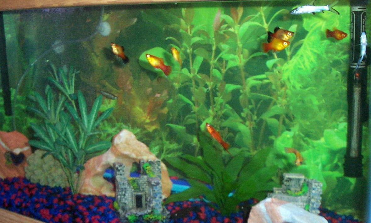 Community tank with platys, plecostomus, danio, mollies, tetra, gourami and bala sharks.