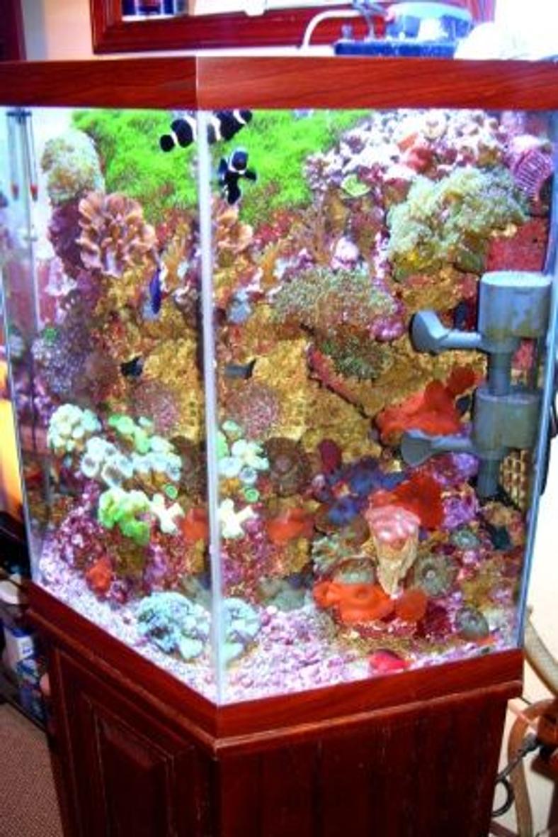 43 Gallon Octagon with a 15 gallon homemade eco-system style refugium/sump (deep sand bed, chaeto, and live rock) and a algae waterfall style supplemental filter. I have had no skimmer on this system for well over a year and no longer have to do water changes. Nitrates and phosphates are 0 and seem to be staying there. My system has in-line UV (now rarely used), 150W 20K metal halide lighting, live rock straight from Fla. to my tank (no "curing"), rock is mounted on a PVC frame as the arrangement is vertical, 2 Koralin and 2 Maxi-jet power heads.