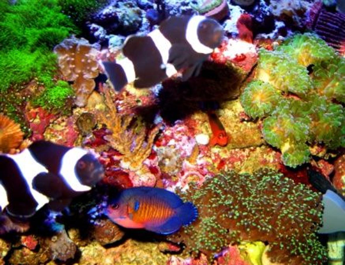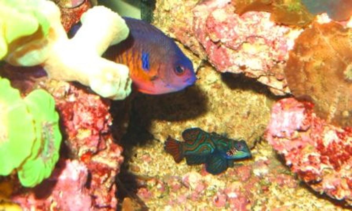 2 Black Ocellaris Clownfish, Red Hawkfish, Coral Beauty Angelfish, and a Mandarin Dragonet.