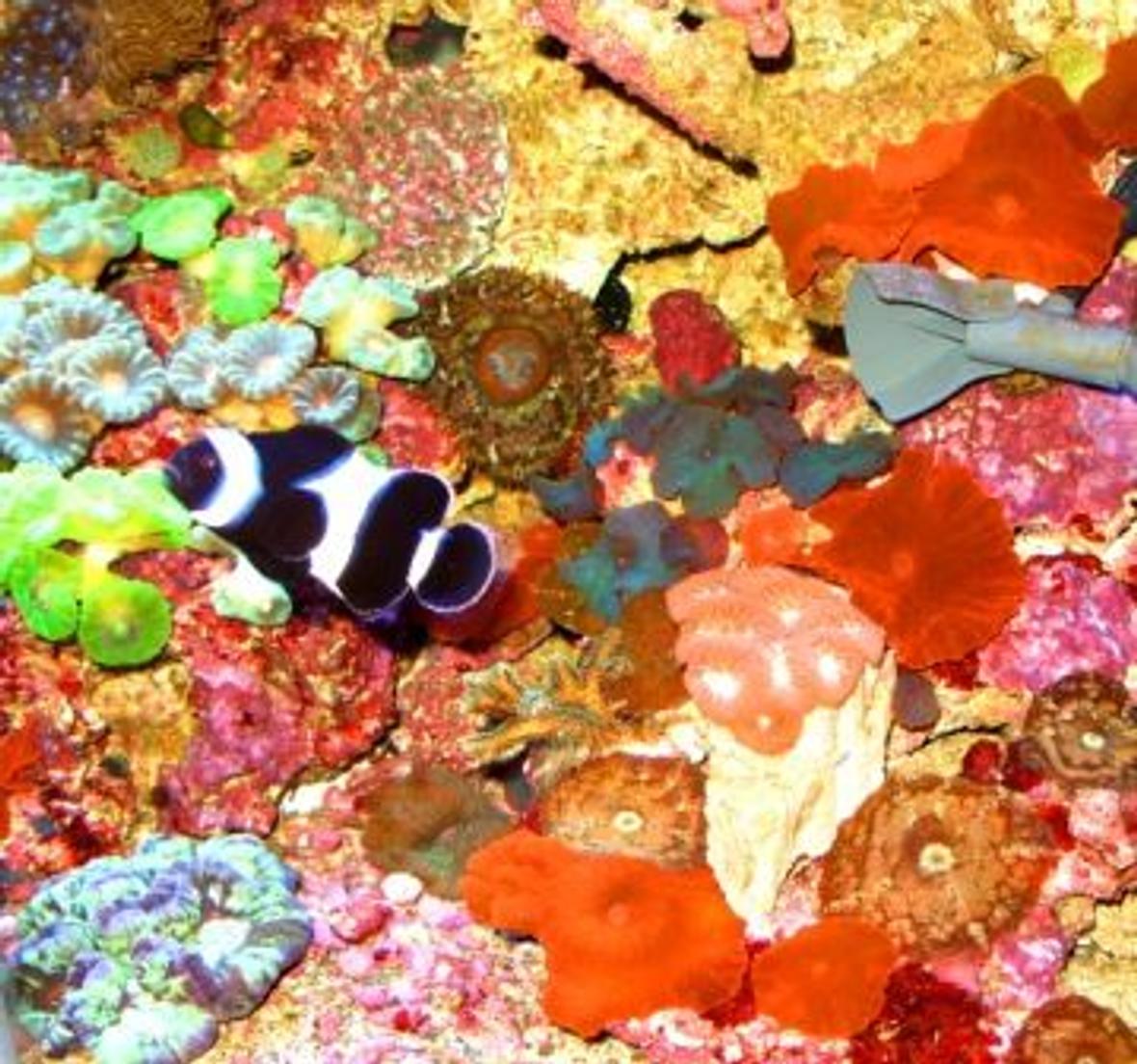 Some Acro's, Cup Coral, Blasto, Wellsophylia, lots of Trumpet Corals, Zoos, Xenia, Pectina, Frogspawn and Hammer Corals, lots of Muchrooms, Green Star Polyps, etc.